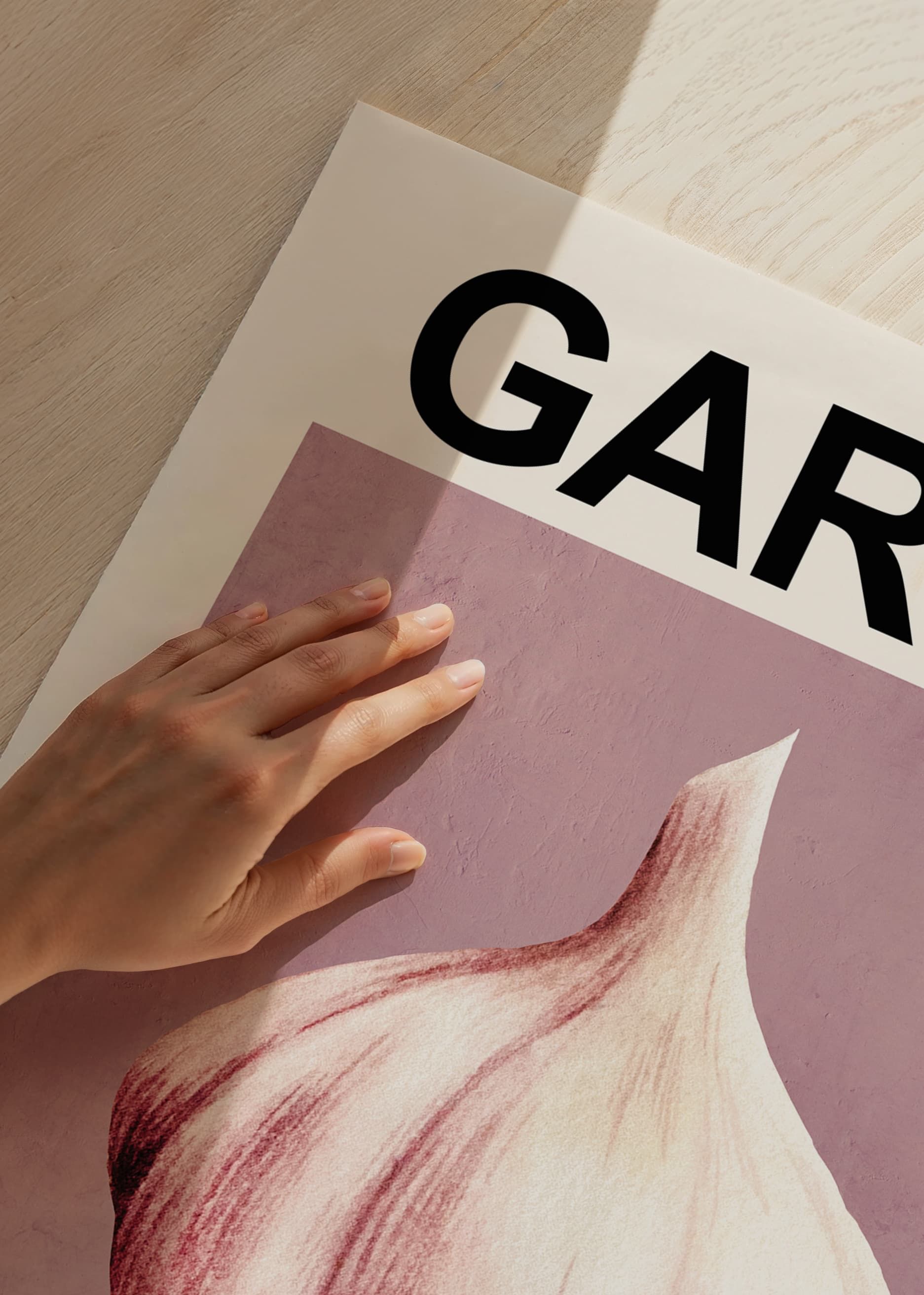The motif consists of a stylized garlic in the center, drawn with soft shadows against a purple background. Below the garlic is a distinctive yellow geometric triangle that gives a modern feel. The graphic style and contrasting colors make this poster a vibrant addition to your kitchen or dining room.