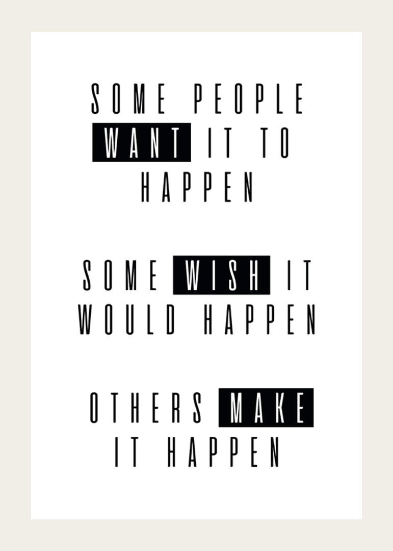 The motif consists of a quote by Michael Jordan written in black capitals against a white background, where the keywords WANT, WISH and MAKE are marked with black squares. A stylish and graphic poster that is perfect for the home workout corner or in the office to inspire initiative.
