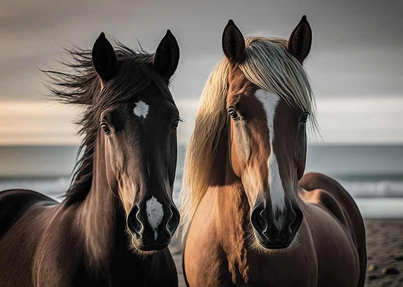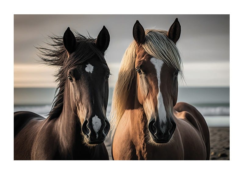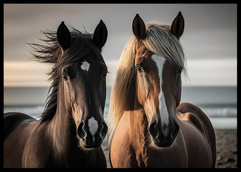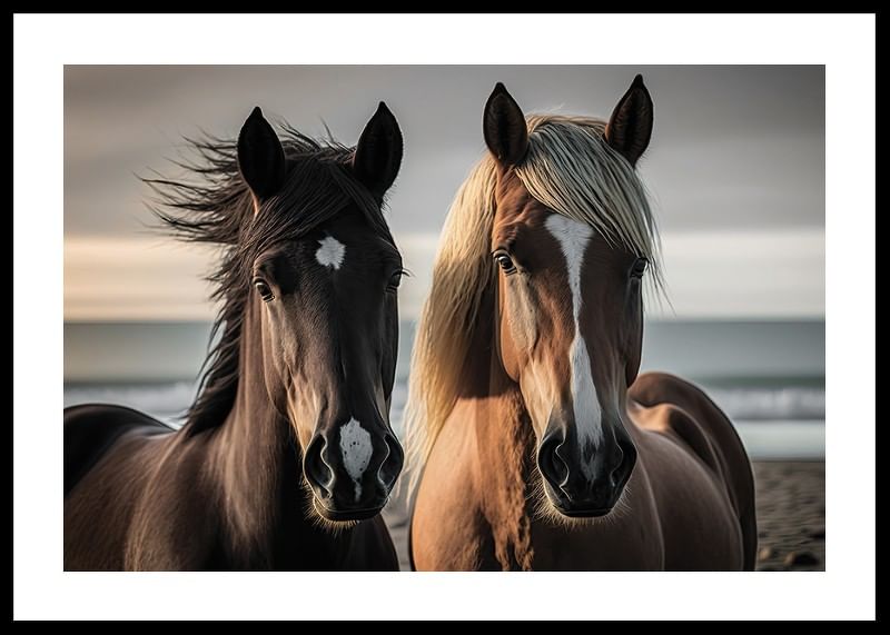 Two brown horses stand side by side with the sea as a backdrop. One has a dark mane and white forehead star, the other a light mane and white blaze. Soft natural tones and detailed shimmer in the fur and mane give a lively feel. This poster adds a calm and natural element to the interior.