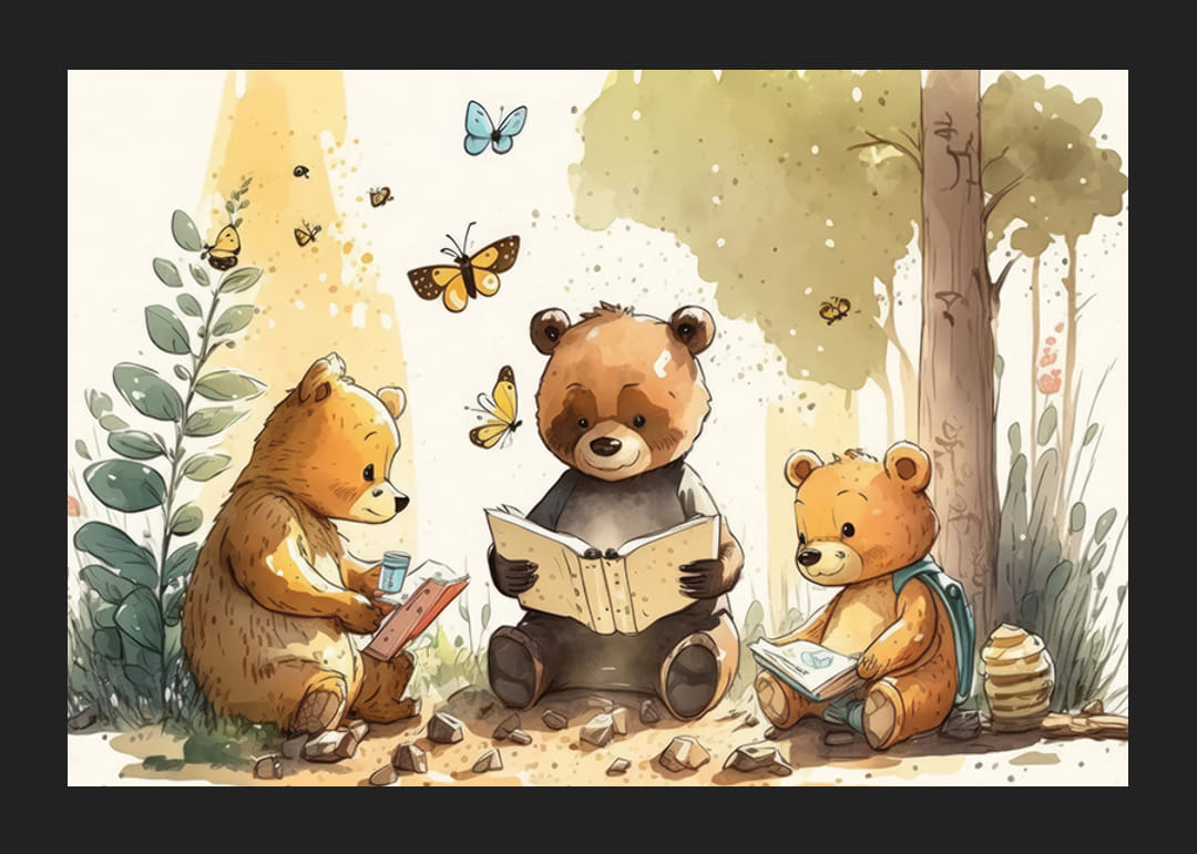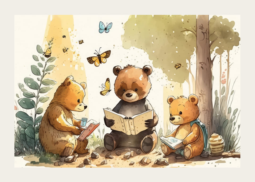 Three bear cubs sit together in a forest grove, each immersed in a book. Butterflies hover above them and cartoon plant details surround the motif. Warm beige and green tones create a peaceful environment. This poster adds imagination and warmth and fits nicely in a child's room or play corner.