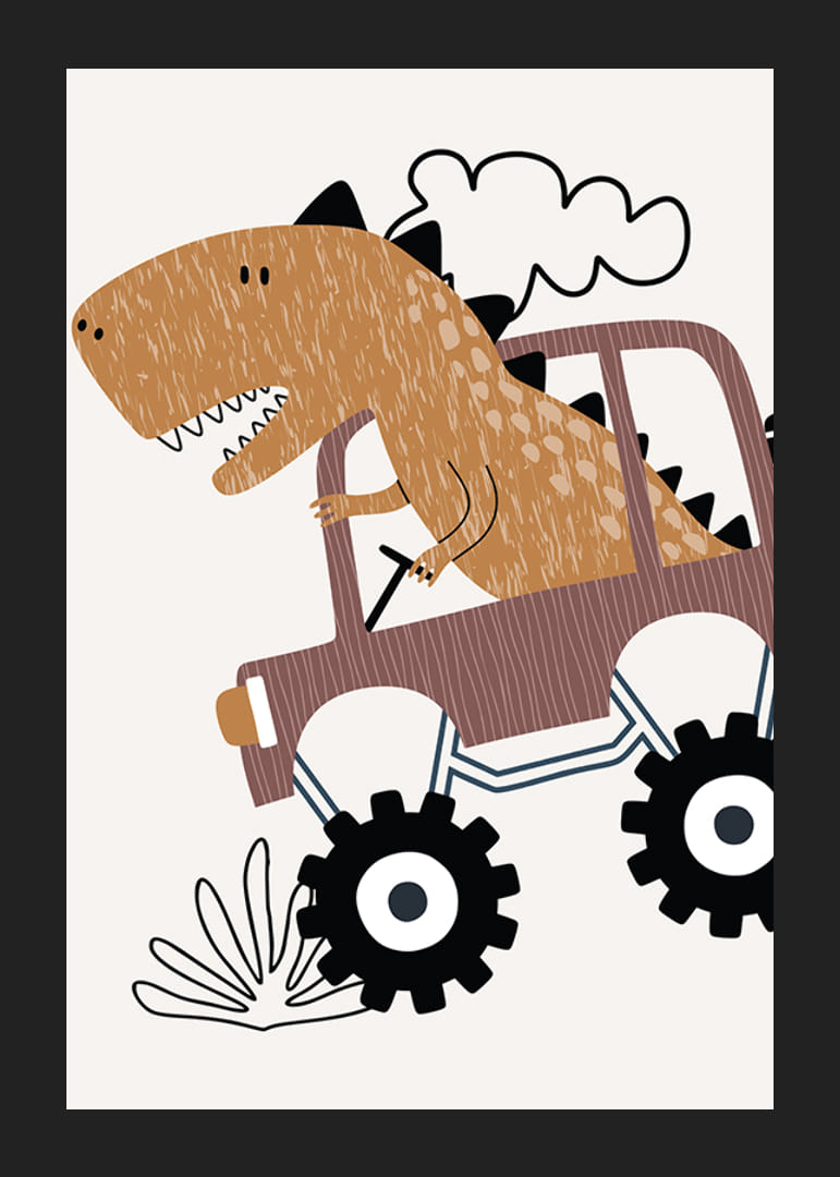 A playful dinosaur with a light brown body and black spikes is seen driving an off-road vehicle with large tires through a stylized landscape. The illustration has soft lines and muted colors on a light background. This poster brings a fun and imaginative feel to a child's room and fits well in any environment where playfulness is appreciated.
