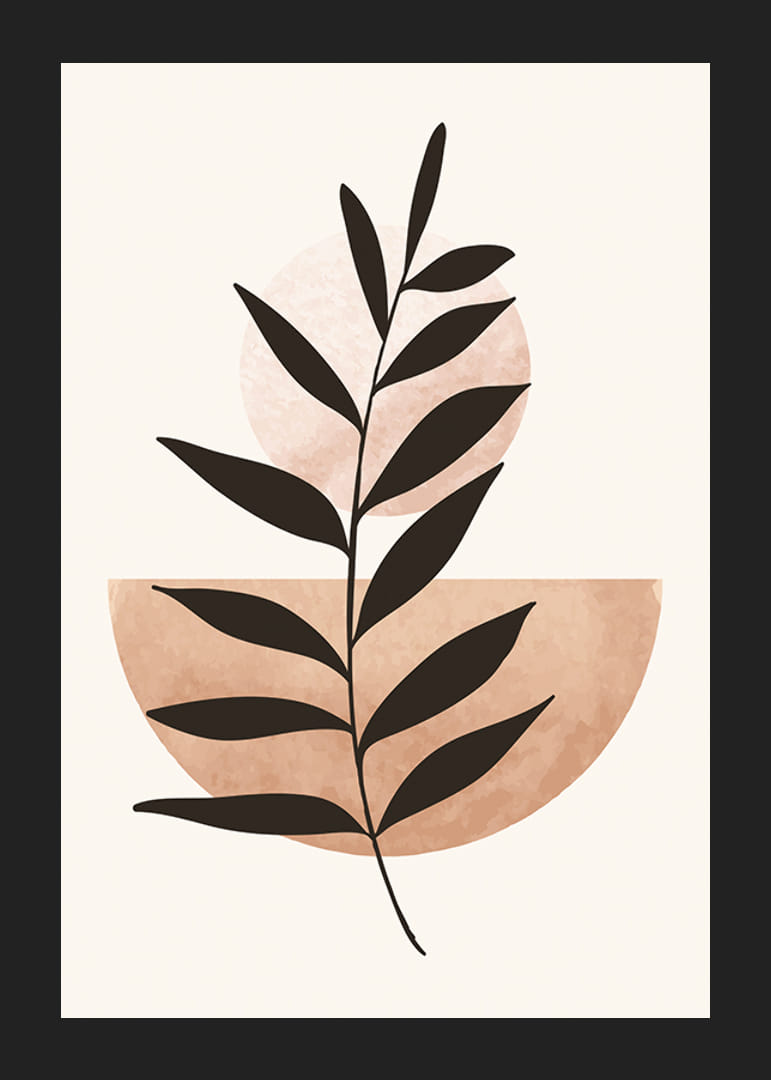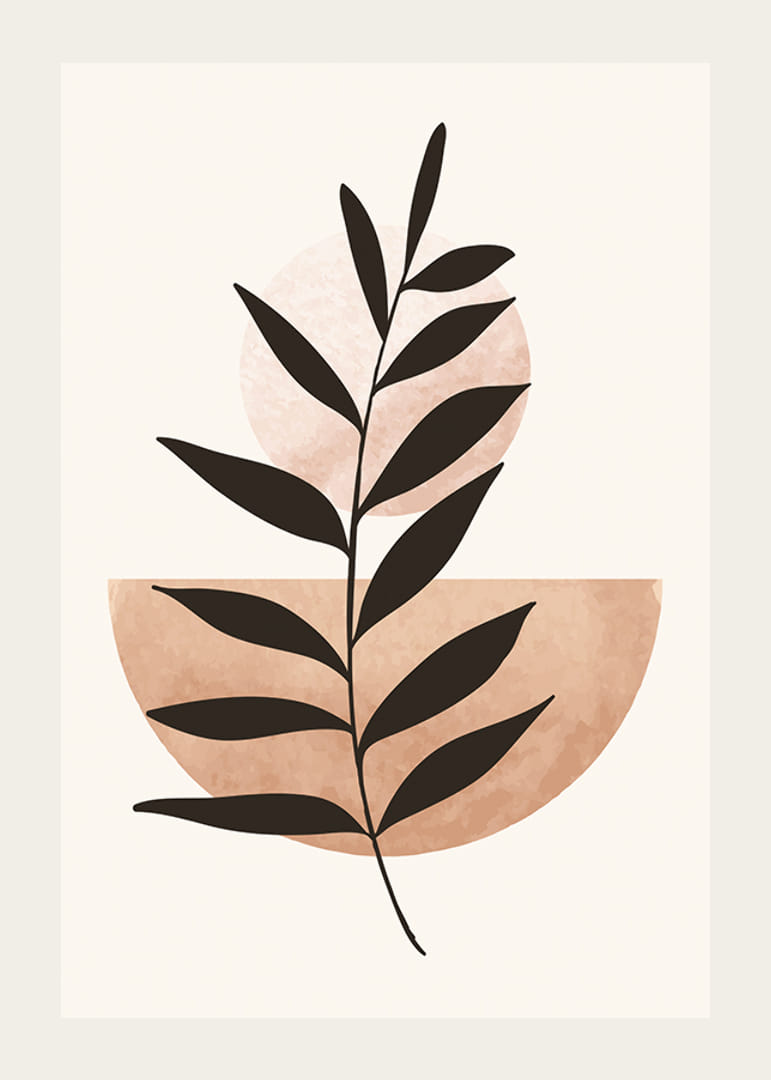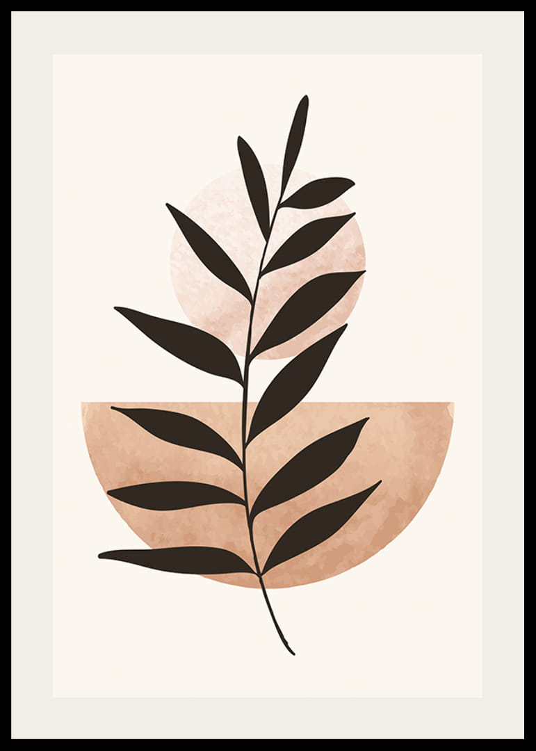 The motif consists of a stylized dark plant silhouette that stretches diagonally across a light background. A light terracotta-colored semicircle and a pale circle interact behind the plant. With its simple graphic composition, this poster fits in both the living room and bedroom and creates a modern and minimalist feel.