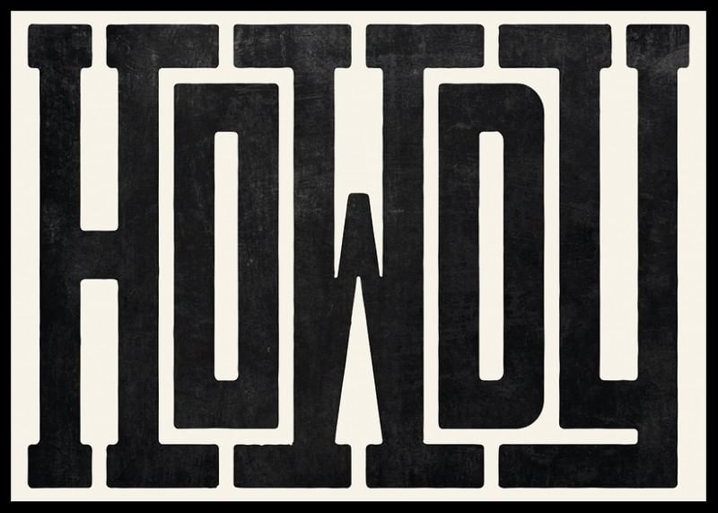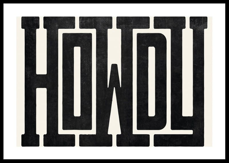 Large, black letters form the word "Howdy" in a robust and distinctly Western-inspired font against a light, sand-colored background. The texture of the letters gives a hand-printed feel that creates visual character. As a poster, the motif becomes a stylish and playful element in both the living room and hallway.