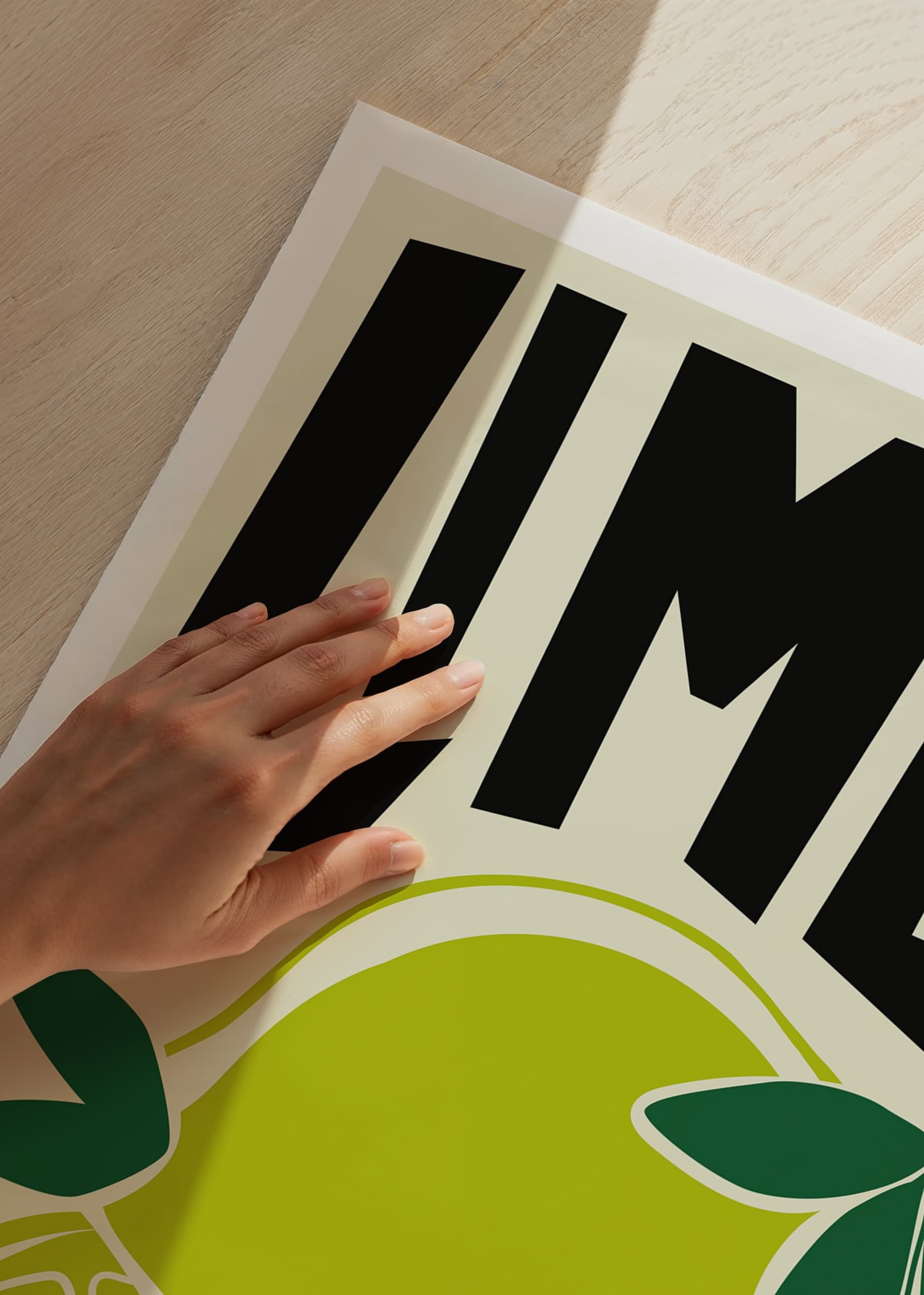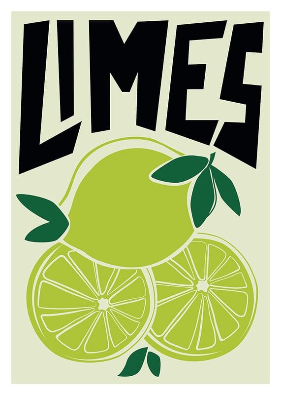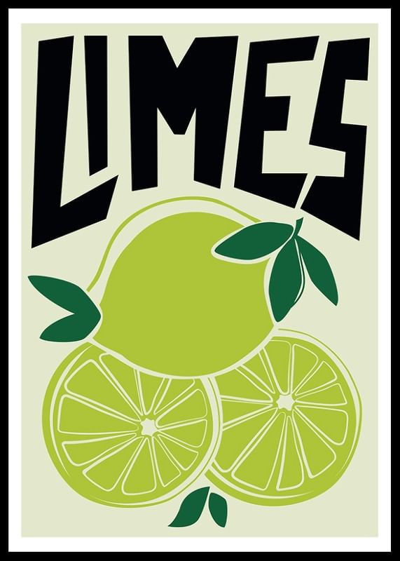 The motif consists of a whole lime and two lime halves in bright green and yellow tones, complemented by dark green leaves. Above the fruits is the text "LIMES" in bold black typography against a light green background. The poster gives a graphic and playful expression and fits well in the kitchen or dining room for a fresh feel.
