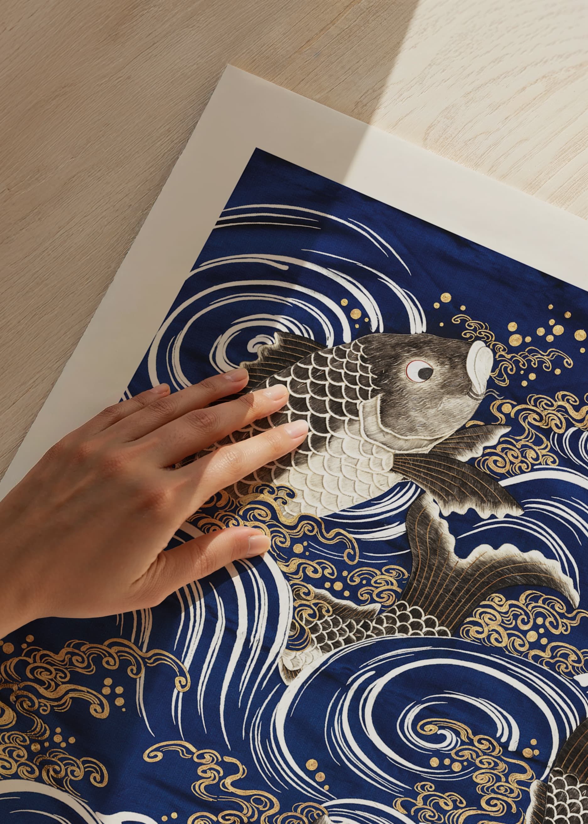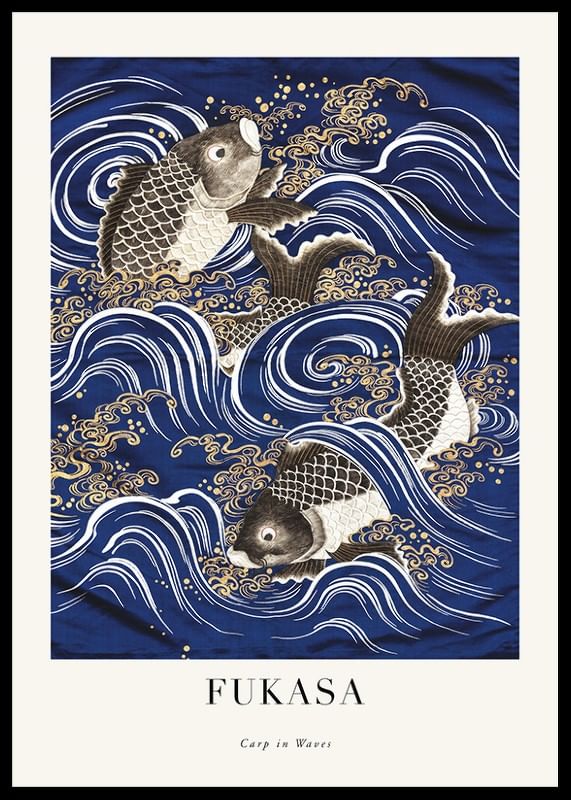 The motif consists of three carps swimming among stylized waves, executed in typical Japanese illustration technique. Deep blue shades meet white and golden lines that create a vivid impression. The combination of nature motifs and graphic style makes this poster well suited for living rooms or offices where Japanese aesthetics are appreciated.