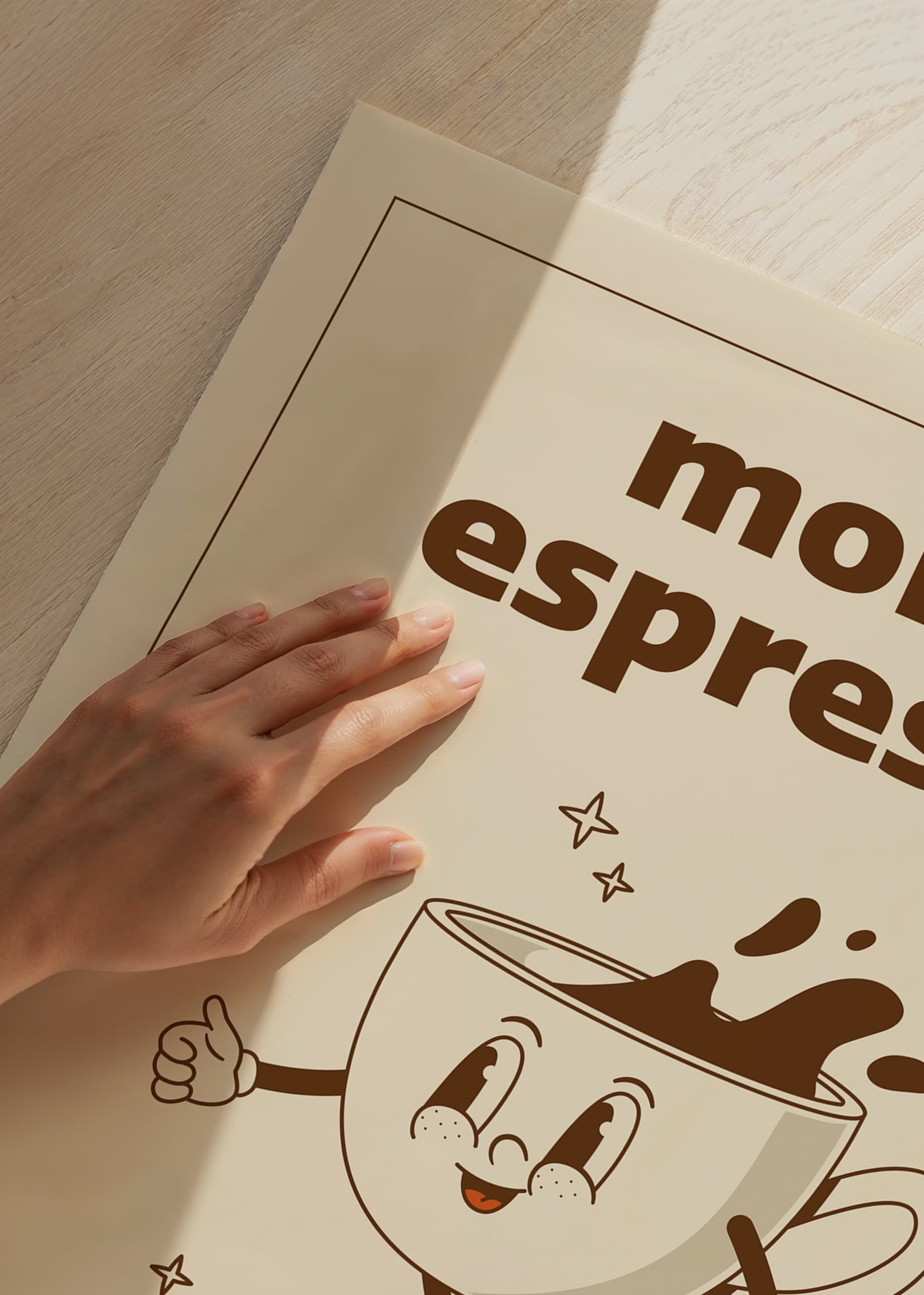 Playful illustration of a coffee cup with happy facial features, arms and legs running, surrounded by small stars. The text 'more espresso less depresso' appears in brown on a warm beige background. This poster has a retro-inspired style that adds humor and character to the kitchen or coffee corner.