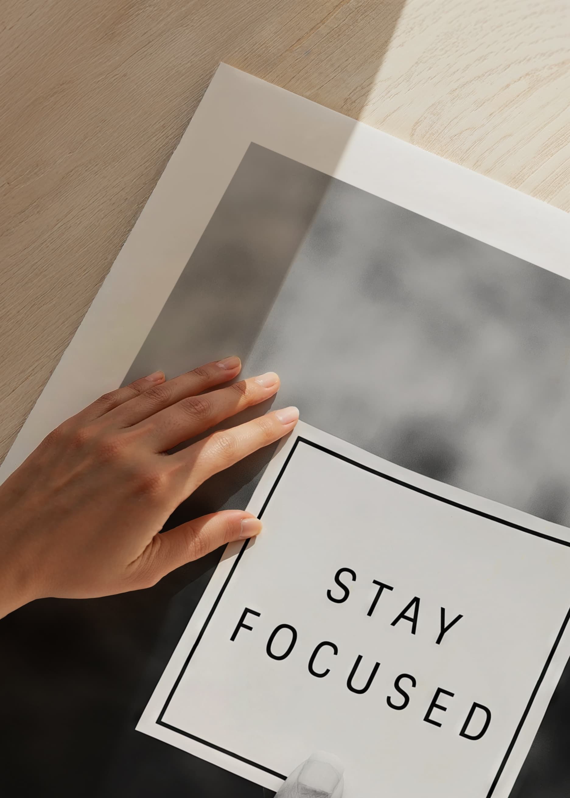 A hand holds up a square note with the text “STAY FOCUSED” against a blurred, gray background. The motif has a simple, graphic feel in black and white tones and clear contrasts. This poster is suitable for home offices or study rooms where a clear reminder of focus and motivation is desired.