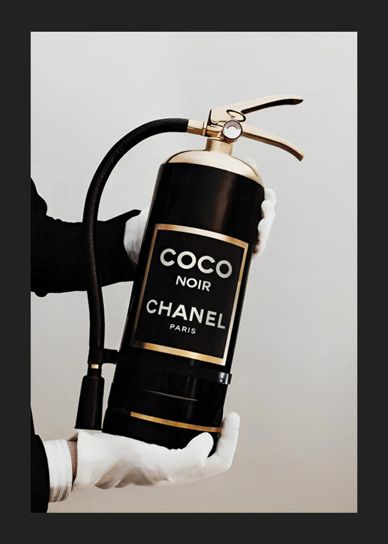 A black fire extinguisher with gold details and a clear label reading 'Coco Noir Chanel Paris' is held by white gloved hands against a light background. This poster combines fashion iconography with everyday objects and fits into modern environments where style meets humor.