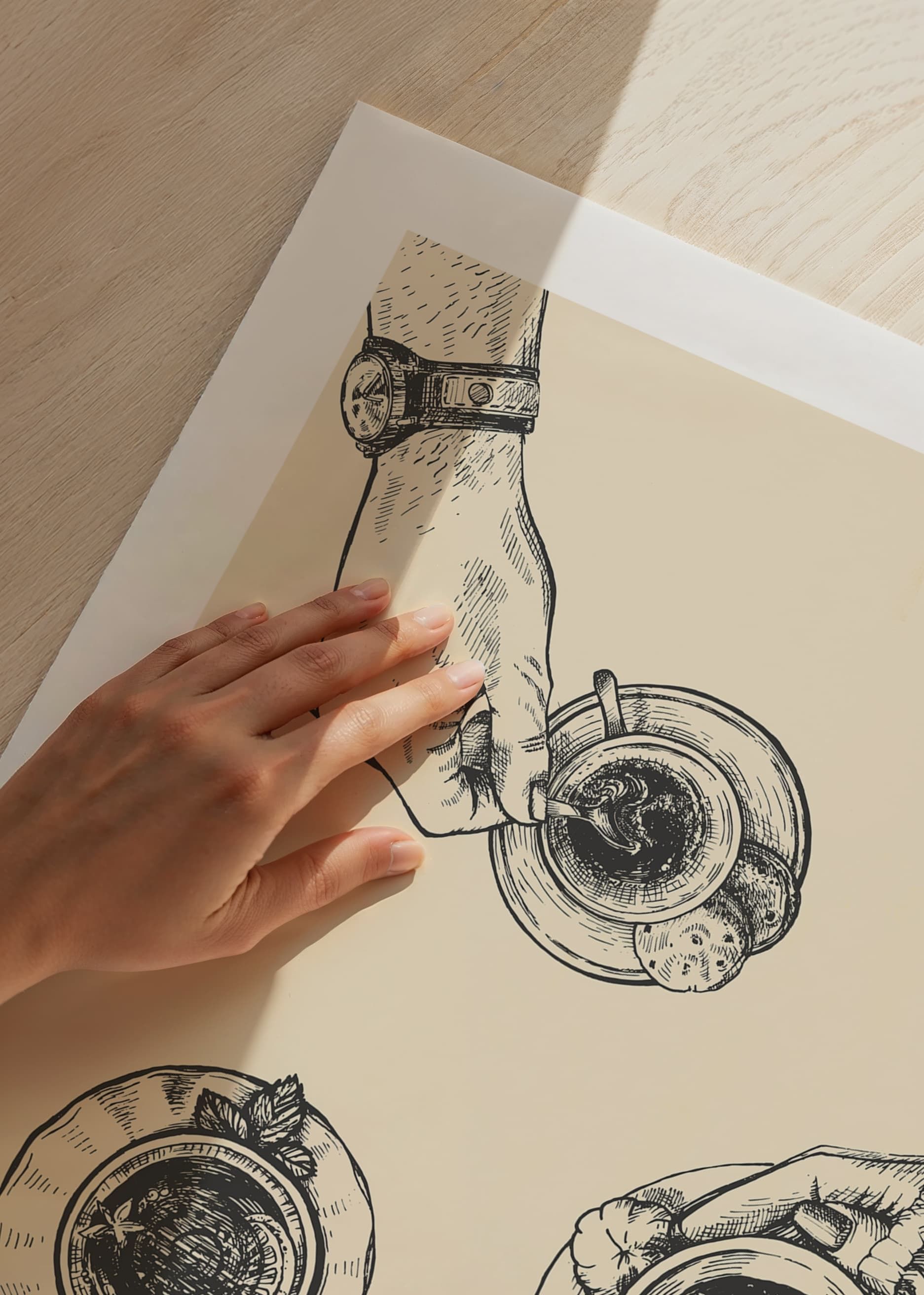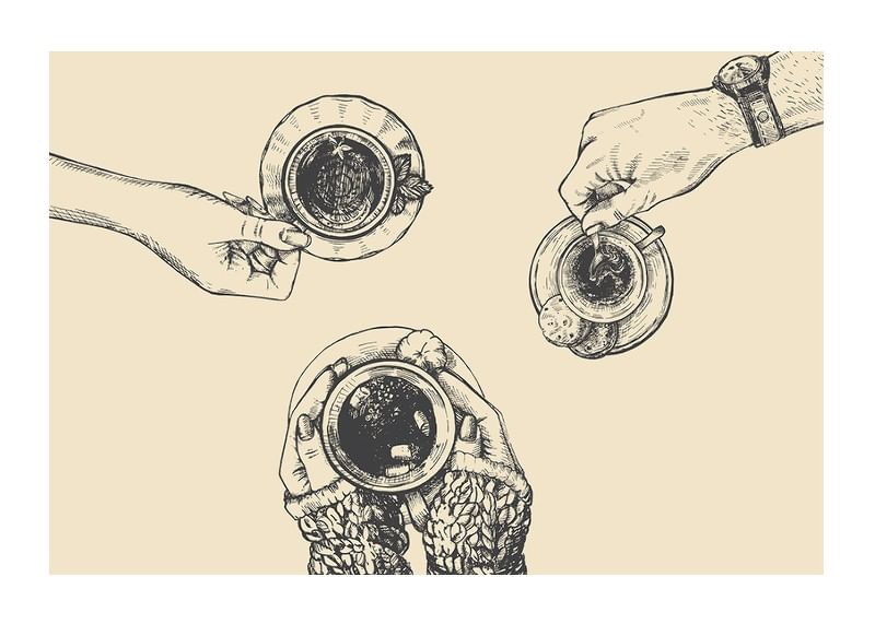 Three hands each hold a coffee cup, drawn in a detailed line style against a sand-colored background. The coffee cups are seen from above and each hand is wearing different accessories and clothing, creating a warm and social feel. This poster is perfect for a kitchen or dining area for a personal touch.