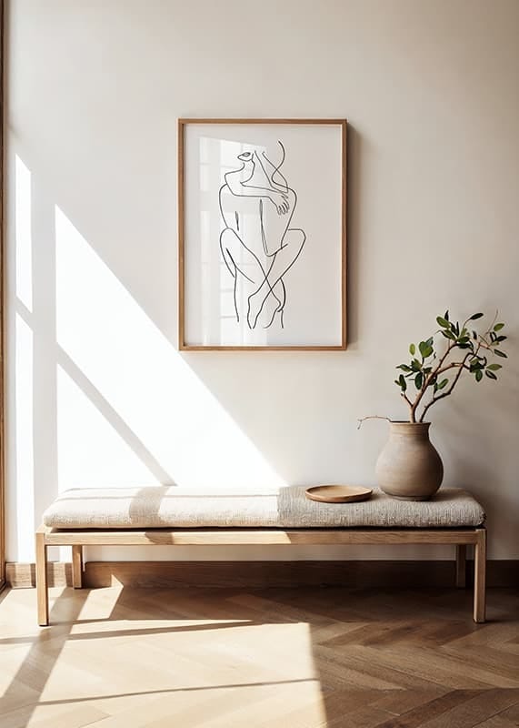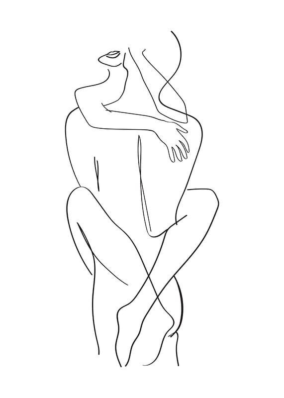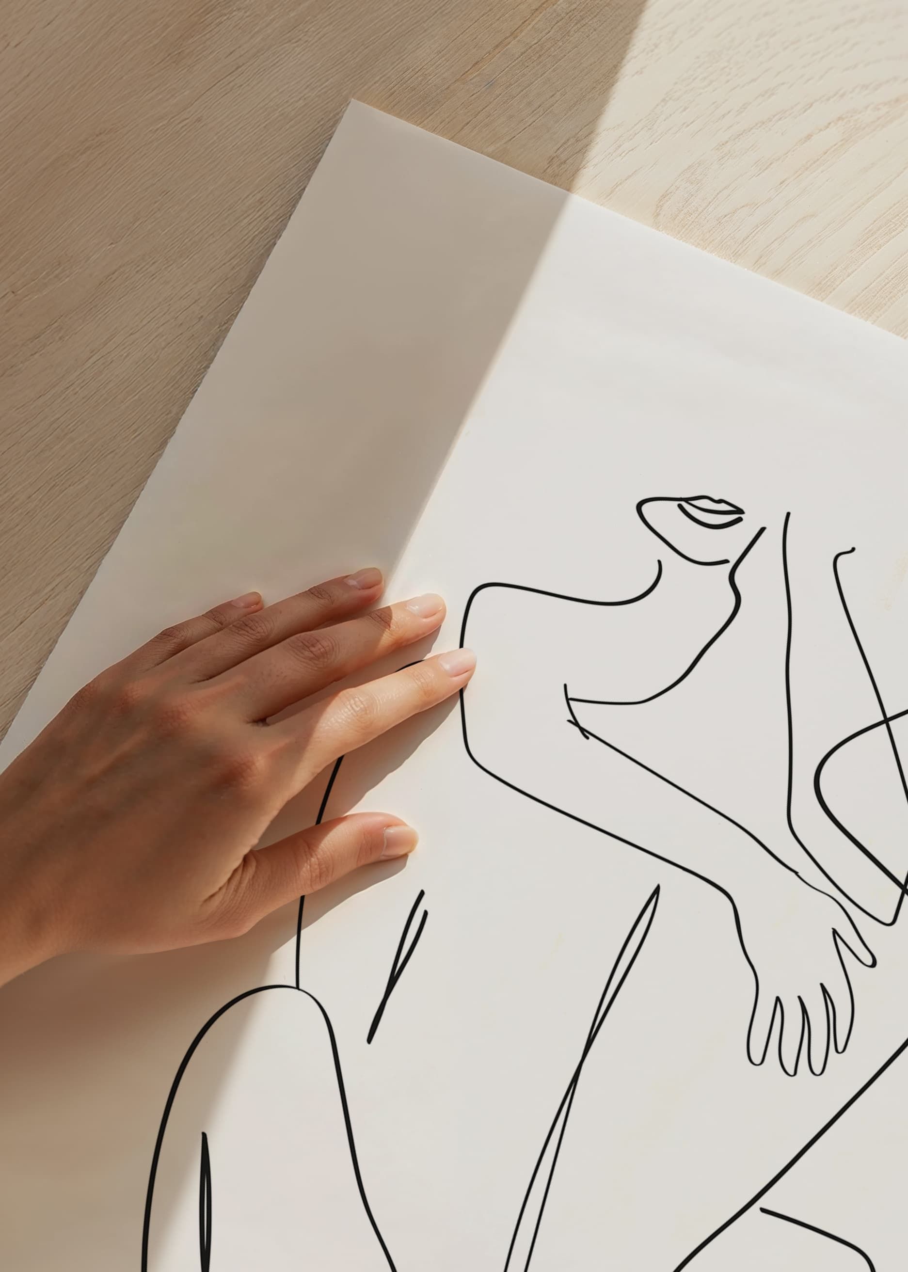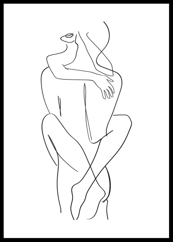 Two people in a close embrace are drawn in stylish black line art where only the contours of the bodies appear against a white background. The simple lines of the motif create a sense of closeness and body language is in focus. This poster adds a contemporary and stripped-down expression to the bedroom or creative spaces of the home.