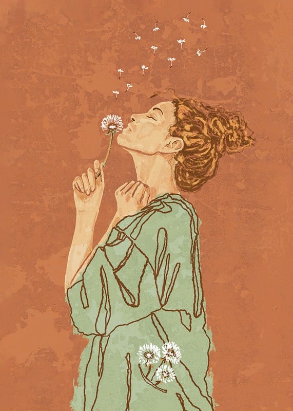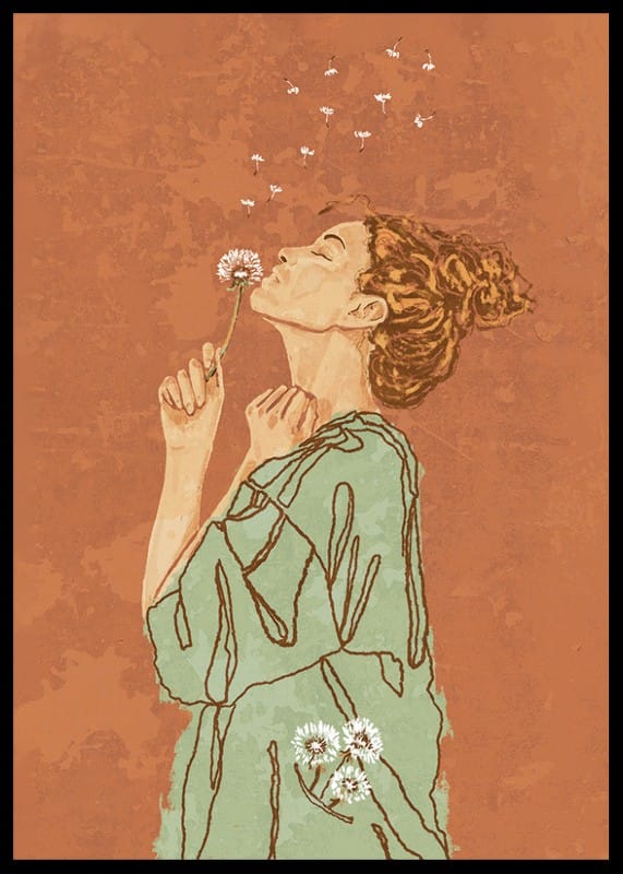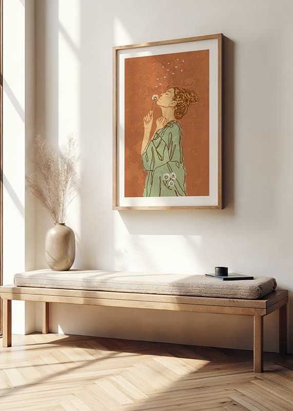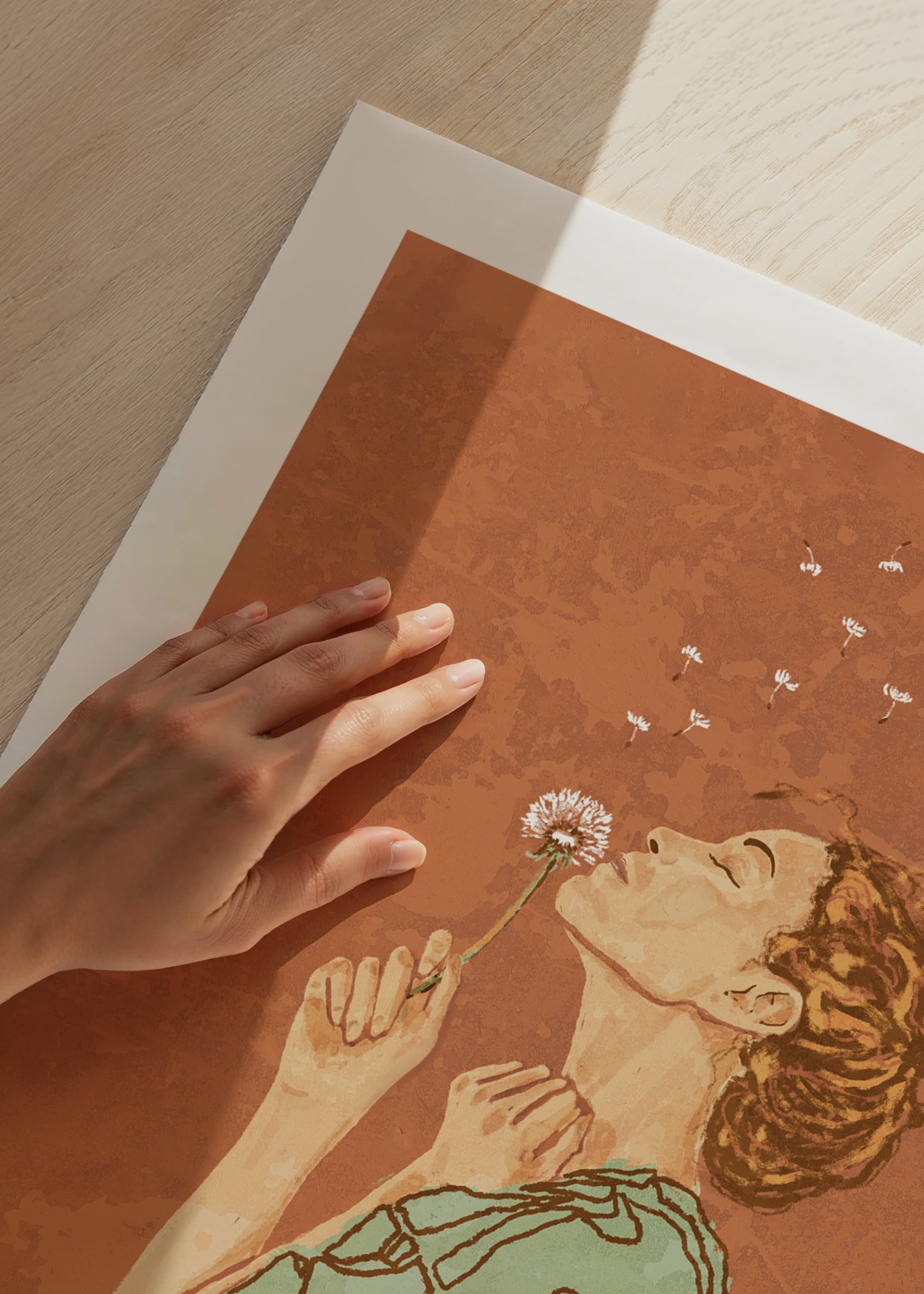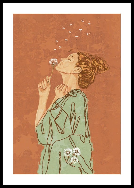 A woman in profile with her hair up is depicted in soft lines and muted colors. She wears a green dress and holds a dandelion close to her face, while seeds float away against a warm, terracotta-colored background. The boho-inspired poster fits well in a bedroom or living room and adds a calm and creative feel to the room.