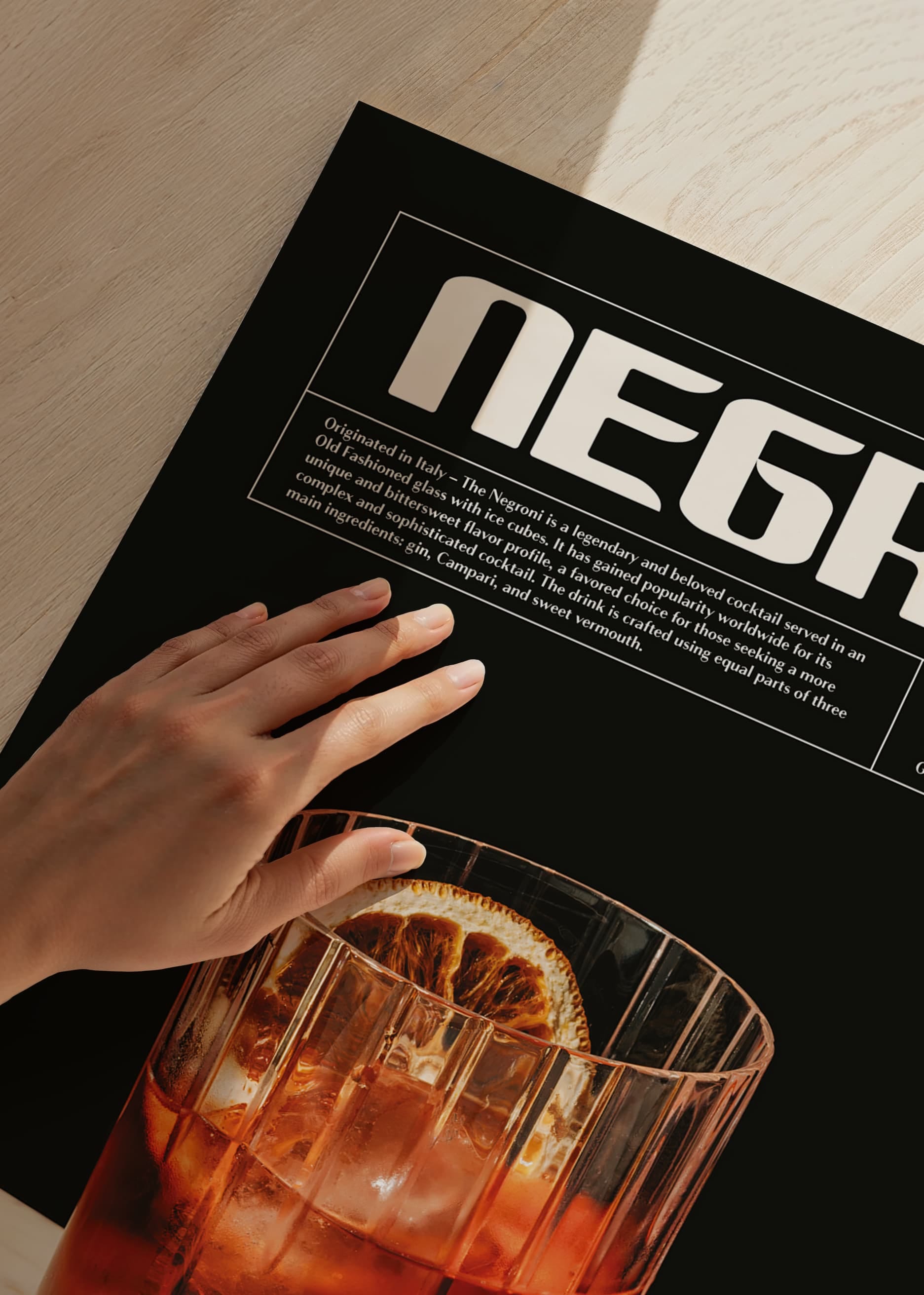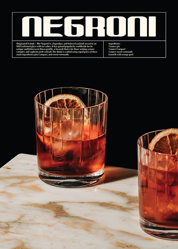 Two glasses of Negroni stand on a light marble-like surface, filled with ice and garnished with a dried orange slice. Against a black background, a recipe and description of the drink are also visible in white text above the motif. This poster has a modern and stylish feel and is particularly suitable for kitchens, dining rooms or home bars to create an elegant atmosphere.