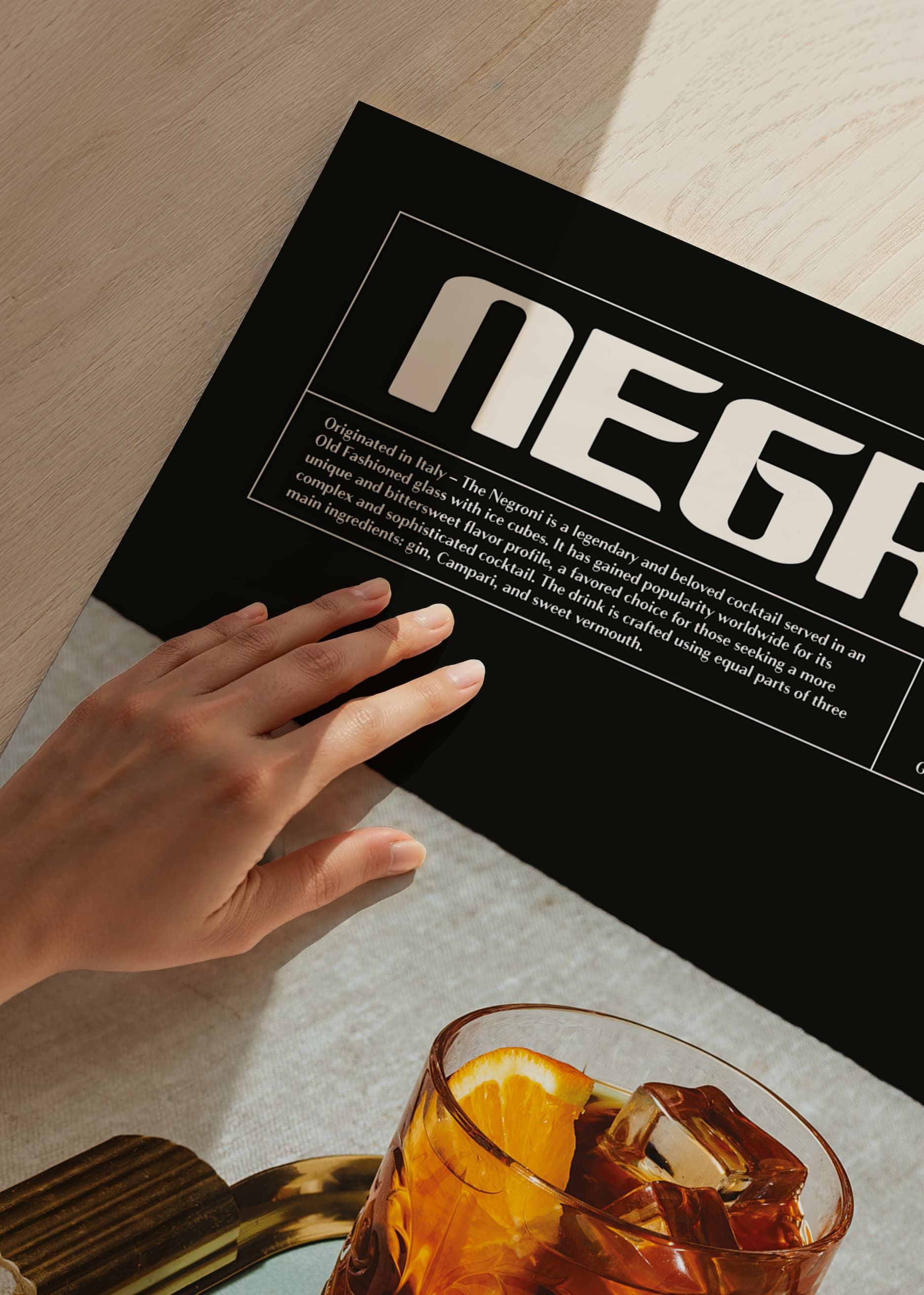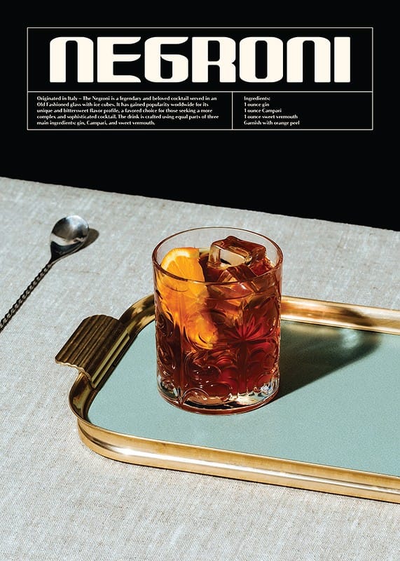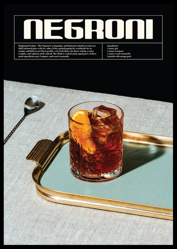 Negroni cocktail in a cut glass with large ice cubes and a slice of orange stands on a light green tray with a gold rim. Above the motif is text with the recipe and background about the drink against a black background. The combination of photo and typography makes this poster a stylish addition to your kitchen or dining room.