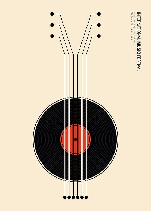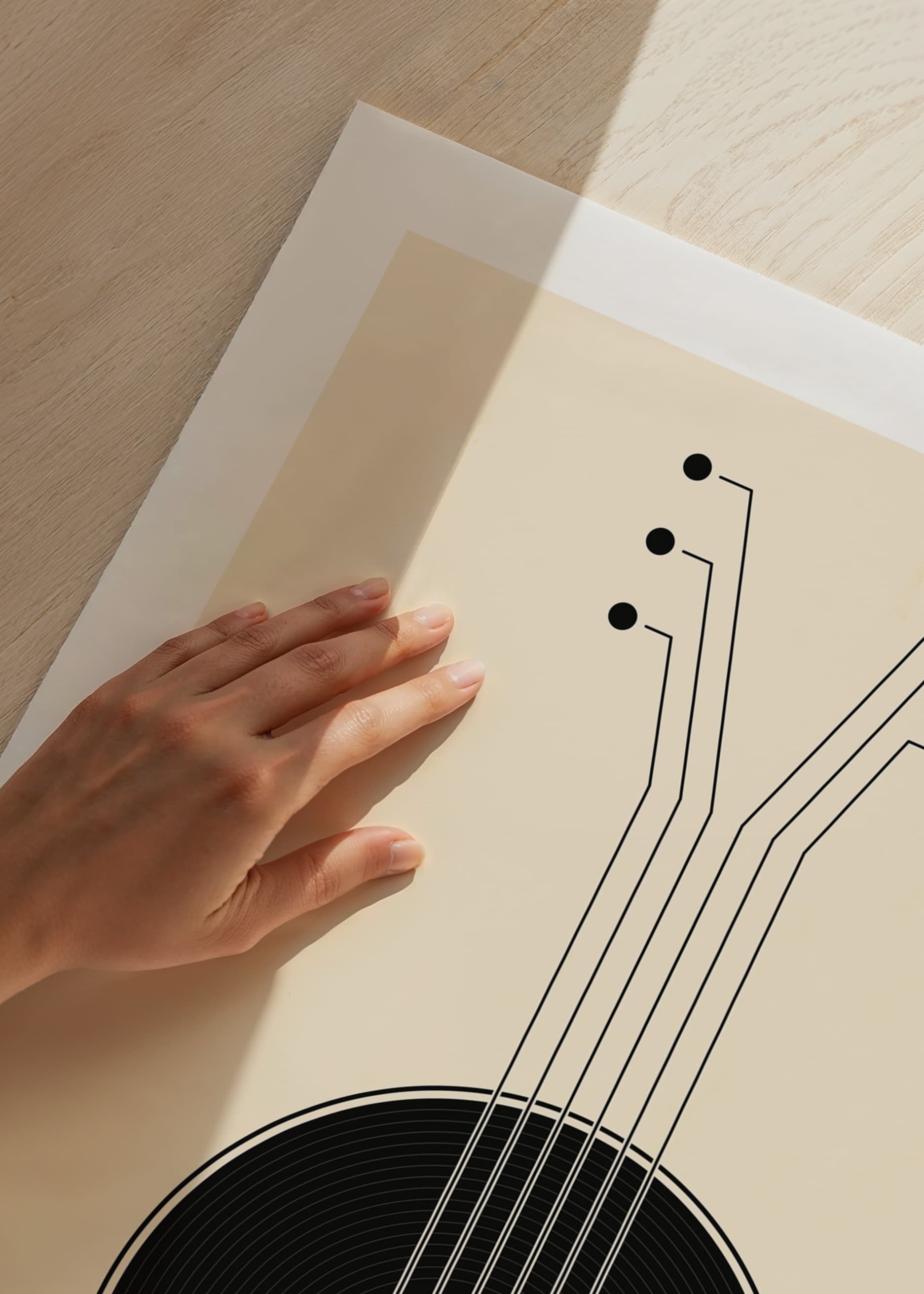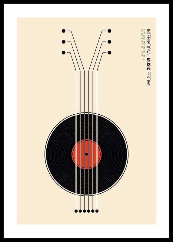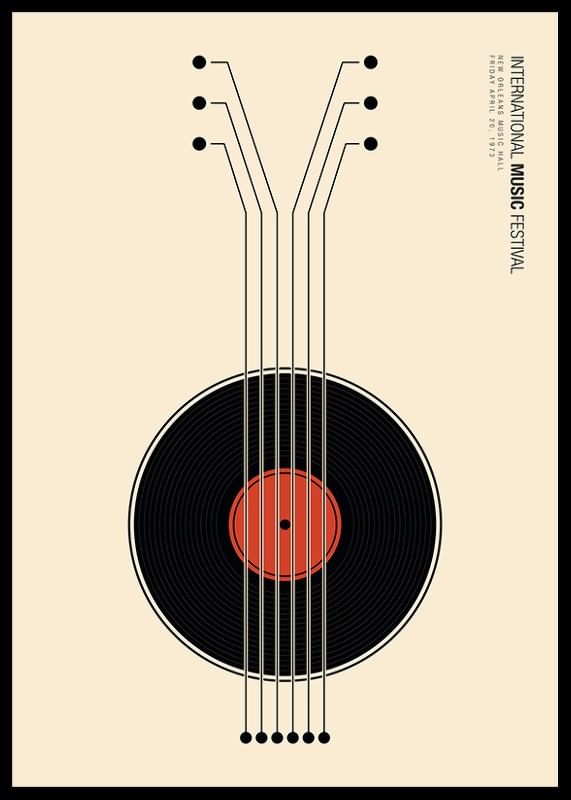 The motif consists of a stylized vinyl record that forms the body of the guitar, with black lines that represent guitar strings up towards the top. The record has clear concentric circles and a red center. The graphic poster in retro style gives a creative feel and fits well in music rooms, living rooms or study rooms where musical interest can be seen.