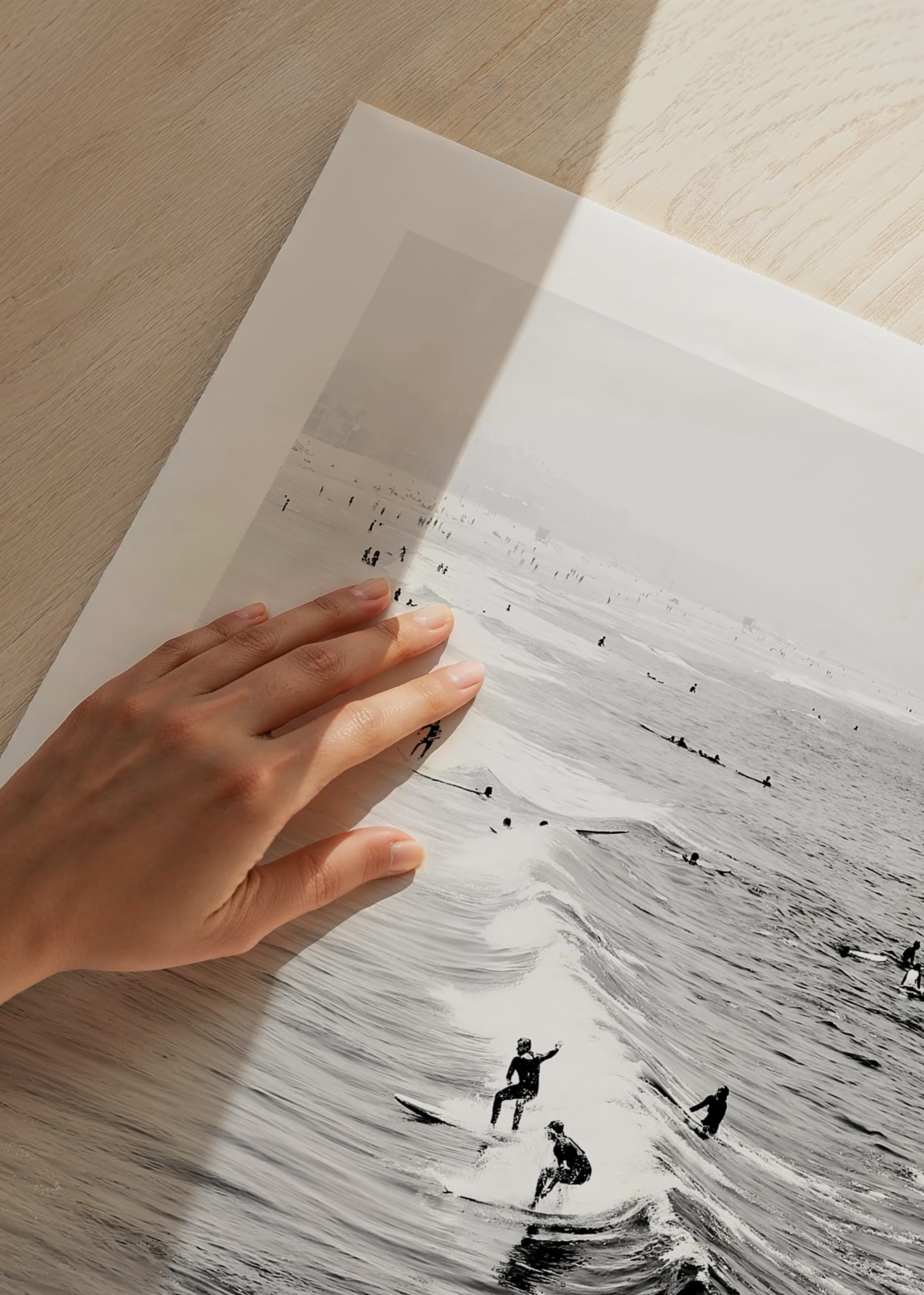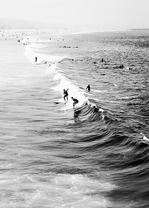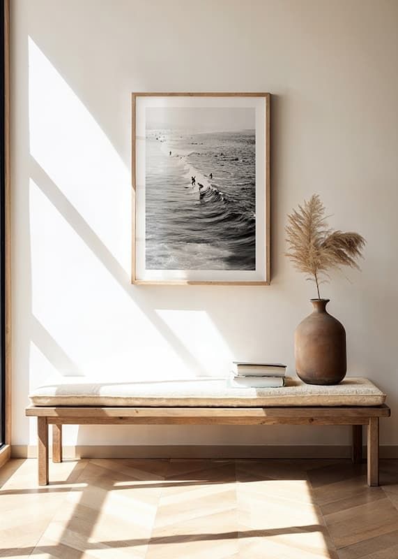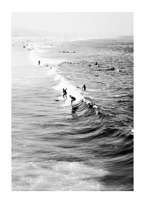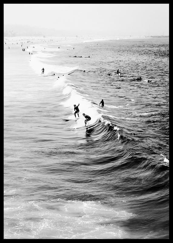 Several surfers capture waves next to a wide beach in a high-contrast black and white photograph. The perspective from above gives a clear overview of the movements of the sea and the people along the beach. This poster creates a dynamic and stylish feel, especially suitable for living rooms or leisure spaces.