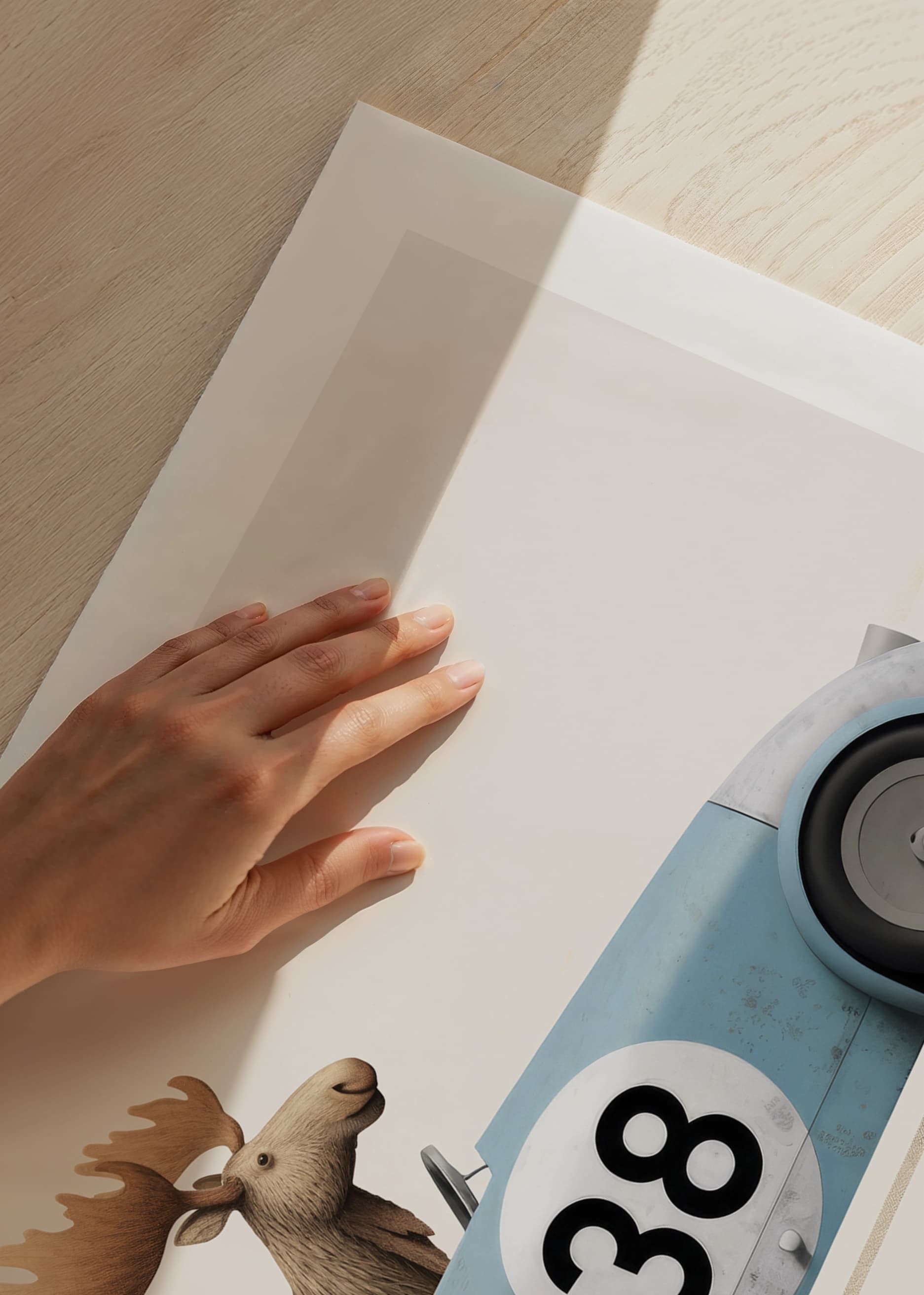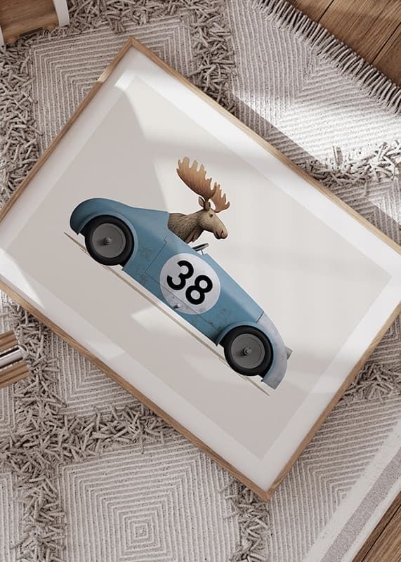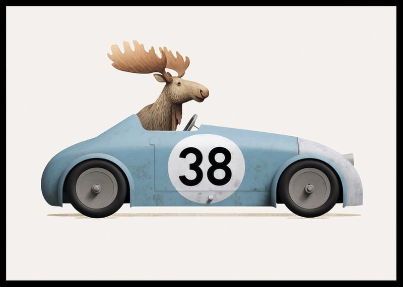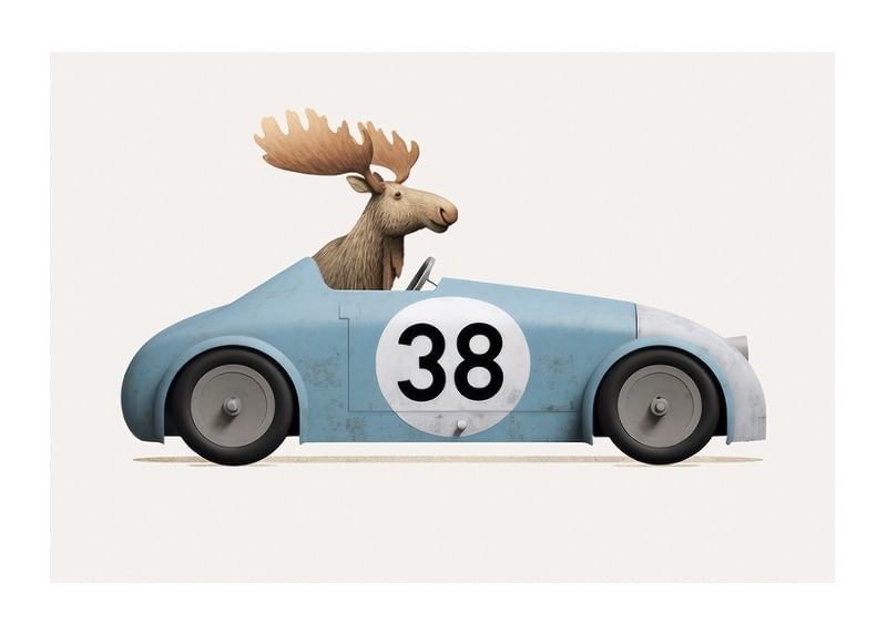 A moose with big horns sits behind the wheel of a classic, blue toy car adorned with the number 38. The light, simple background highlights the motif and creates a playful expression. The gentle color scheme fits nicely into the children's room and gives an imaginative feel. A poster that adds humor and character.