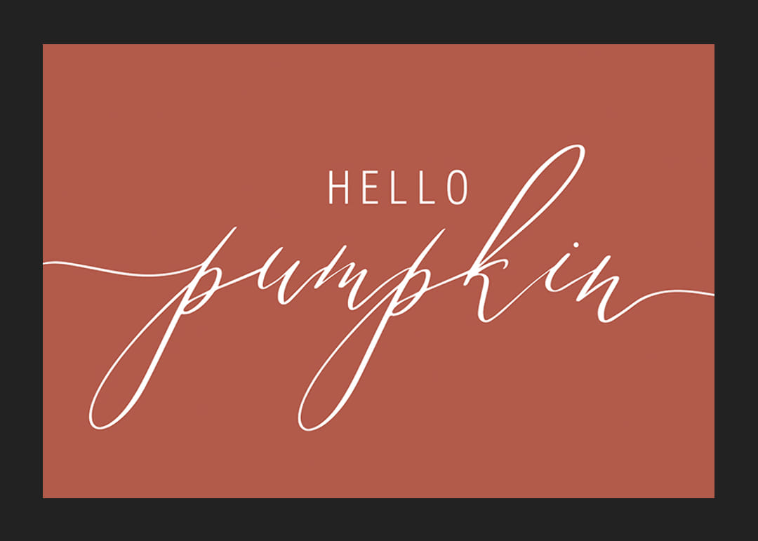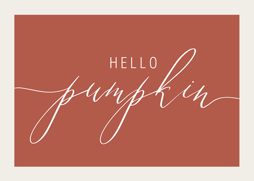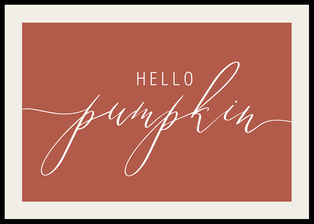 Warm autumn red background with the phrase 'Hello Pumpkin' in clear white writing. The combination of simple uppercase text and sweeping italics gives a stylish, seasonal feel for autumn and Halloween. A text poster that creates a welcoming tone and is suitable as a decorative detail in the home.