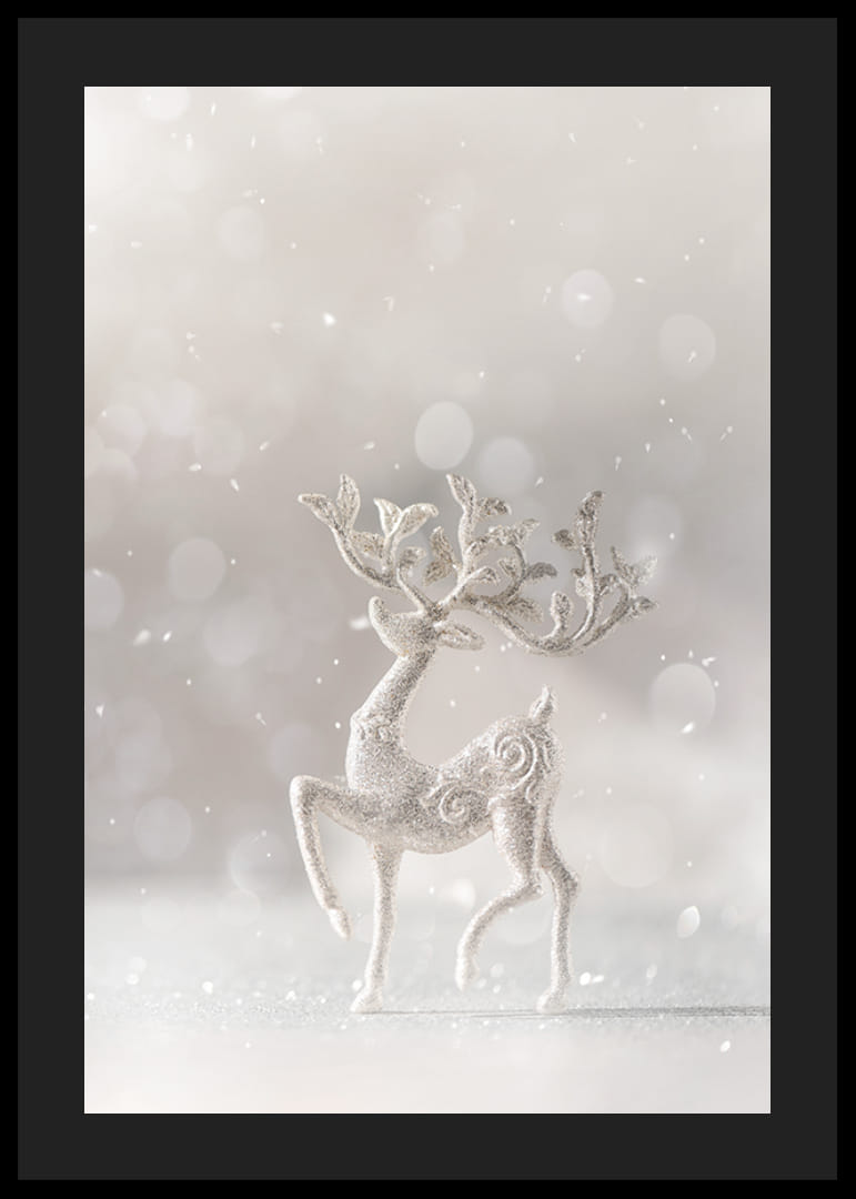 A glittering silver deer with elegant, squiggly antlers stands against a bright, blurred background. Subtle snowfall and soft light create a wintery feel to the motif. The clean color palette of white and silver makes the poster an atmospheric addition to a living room, hallway or seasonal decor.