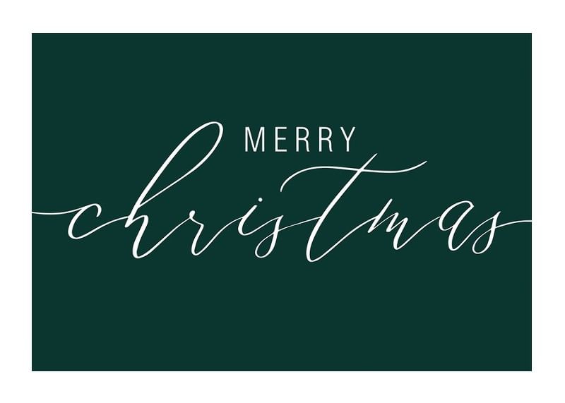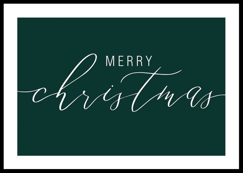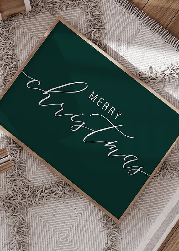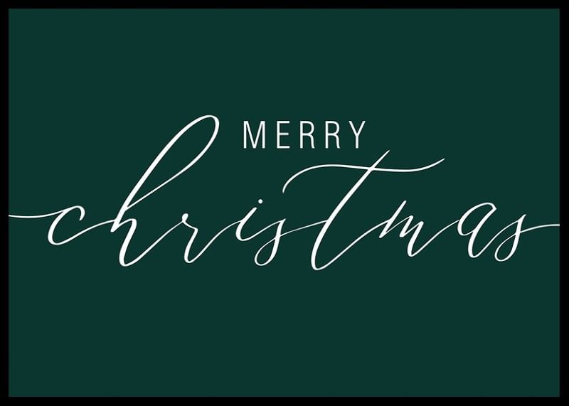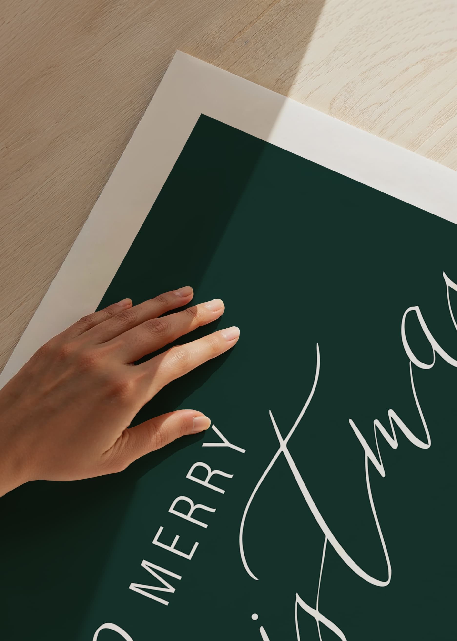 Elegant Christmas greeting in white with the words “Merry Christmas” placed against a deep green, solid background. The contrast between the handwritten writing style and the clean lines gives a stylish feel. This poster fits nicely in the living room or hallway and contributes to a festive atmosphere during Christmas.