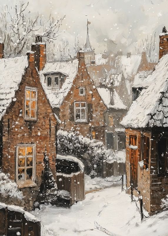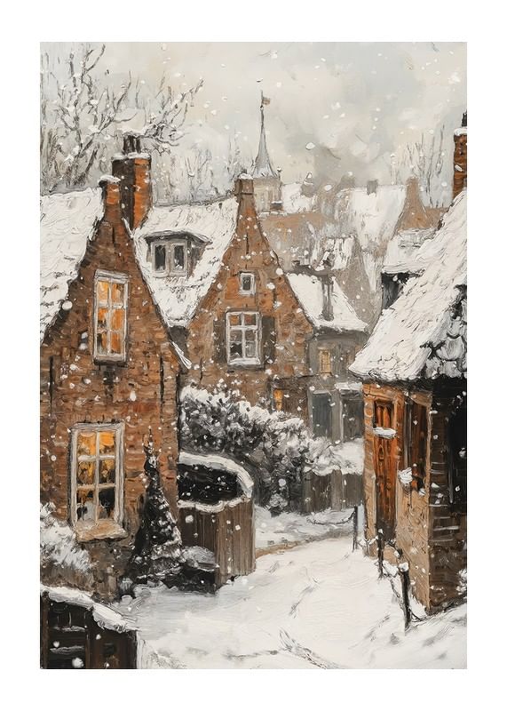 Brown stone houses with snow-covered roofs and warm lights in the windows create an atmospheric winter scene. Large snowflakes fall over the narrow alley and bare tree branches frame the scene. This poster gives a sense of tranquility and community, especially suitable for a living room or hallway during the winter season.