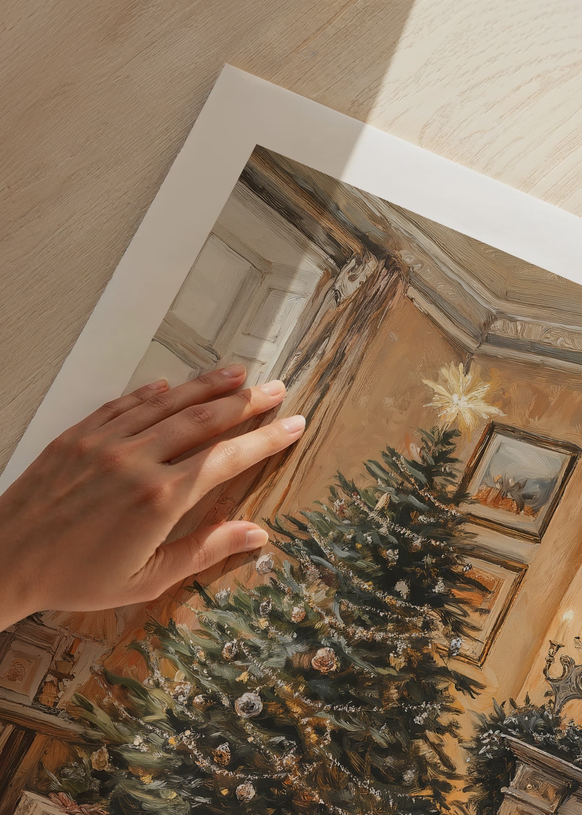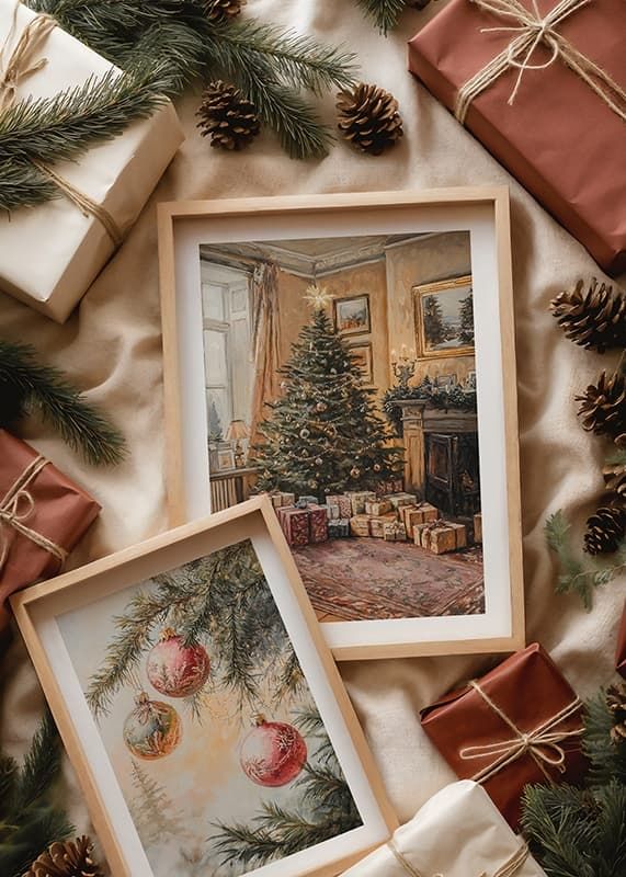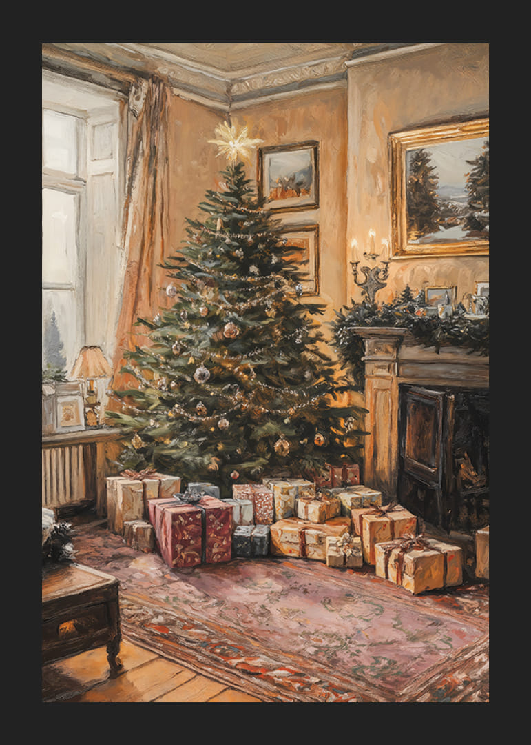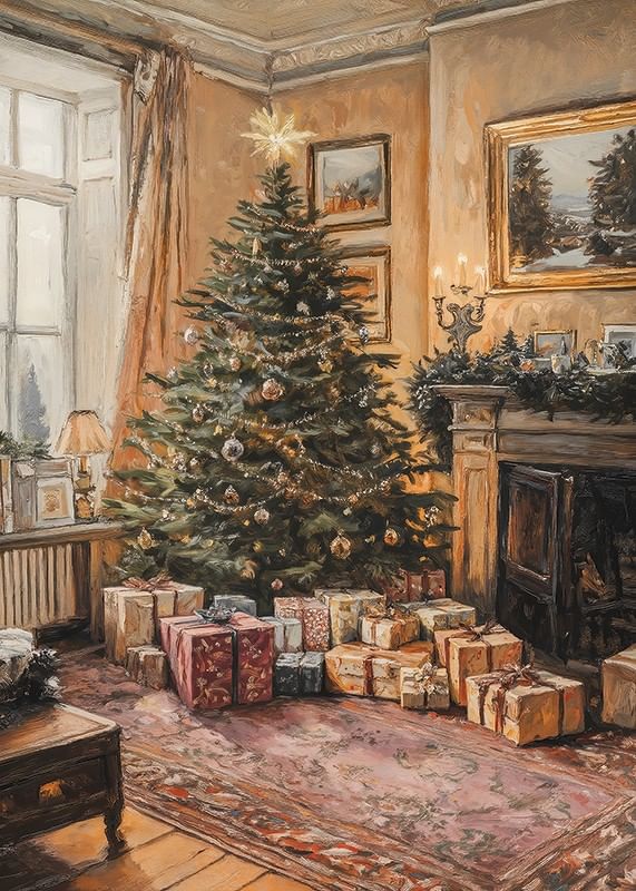 A Christmas tree decorated with baubles and string lights stands in a traditional living room with warm lighting and touches of greenery around a fireplace. Carefully wrapped packages are placed around the base of the tree on a patterned rug. This poster creates an inviting feel to the home during the holiday season.
