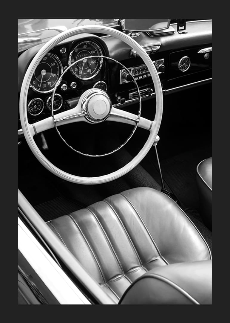A detailed close-up of a classic car interior in black and white, with the steering wheel, dashboard and leather seats in focus. The contrast between the shiny metal surfaces and the soft leather gives the design a timeless feel. This poster is particularly suitable for a modern hallway or a stylish living room.