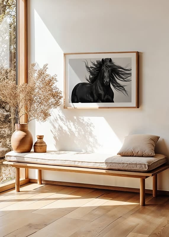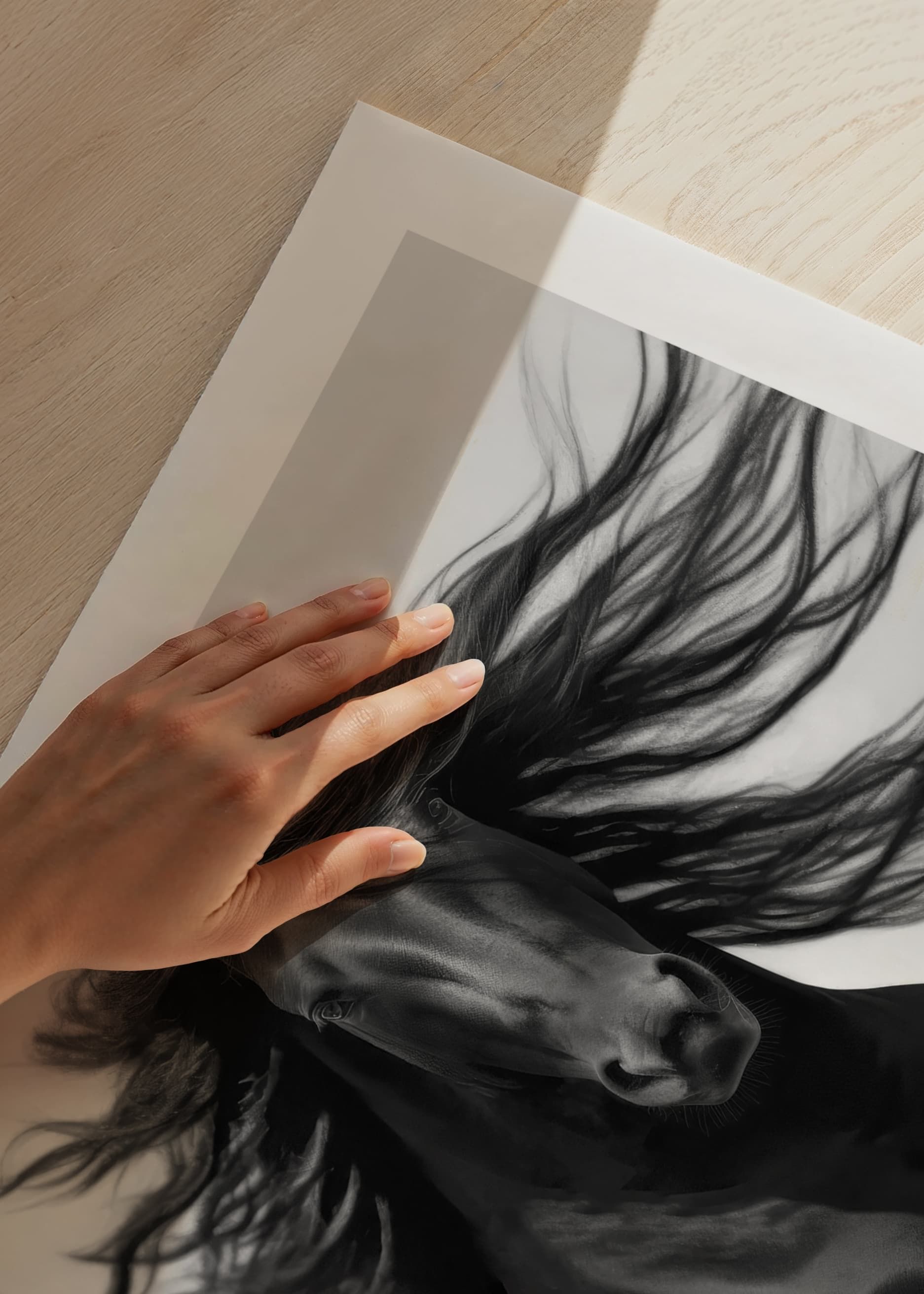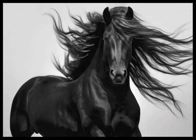 Close-up of a jet-black horse with a long, flowing mane moving dramatically to the side. The motif is black and white and the background is light, which highlights the contrast and the animal's muscular body. This poster makes a powerful impression and is suitable for both living rooms and study rooms where clear shapes are appreciated.