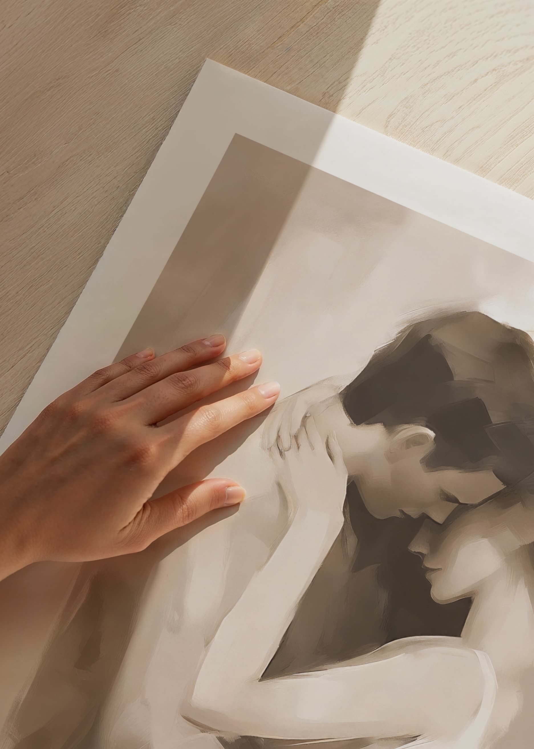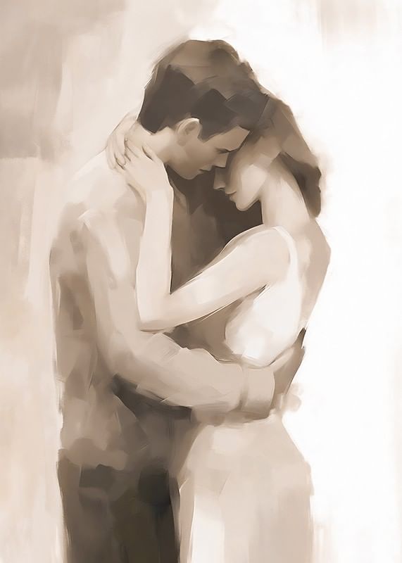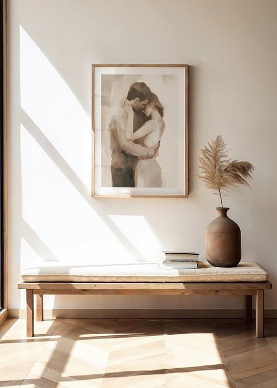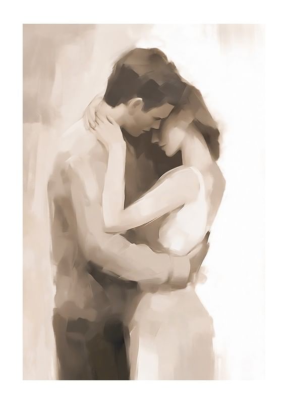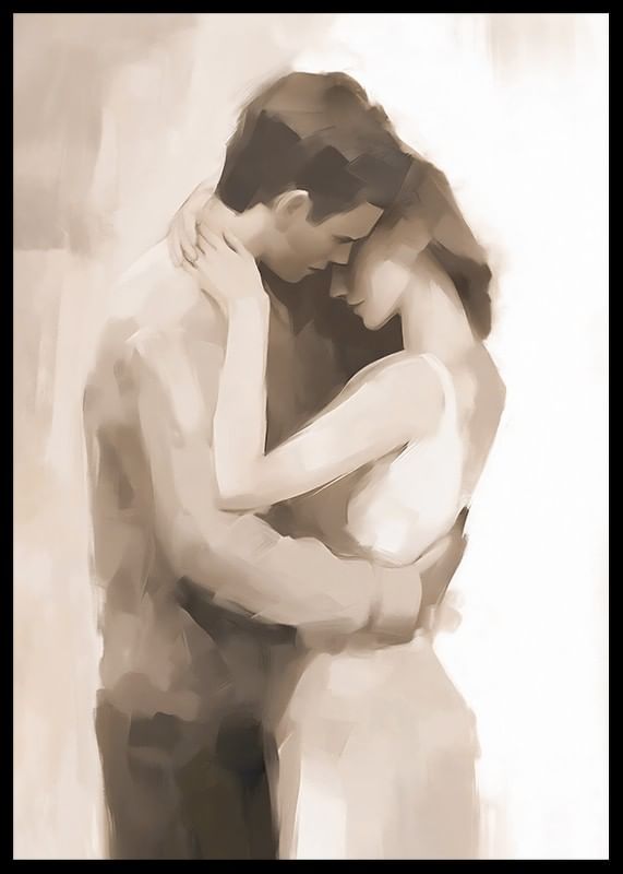 Softly painted silhouettes of a couple embracing each other are visible in the motif, executed in warm beige and brown shades. Abstract brushstrokes create a lingering feeling and subtle movement. Decorate your bedroom or living room with this poster for a stylish and emotional feature on the wall.