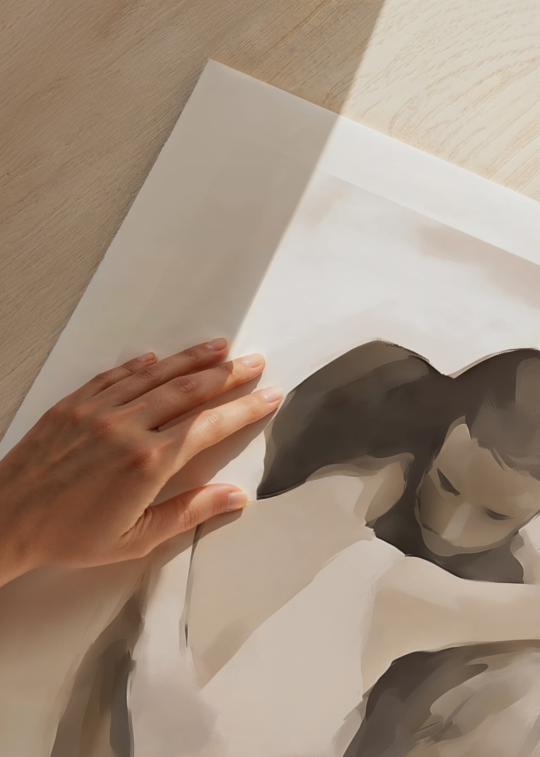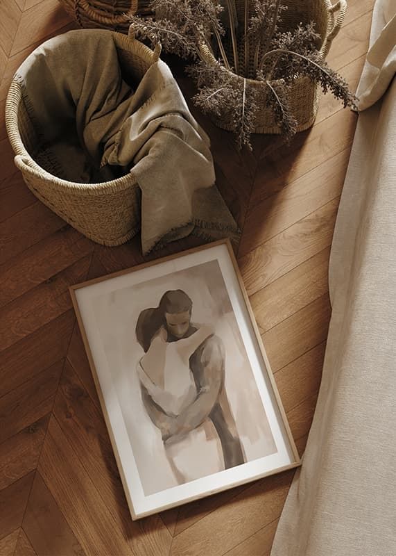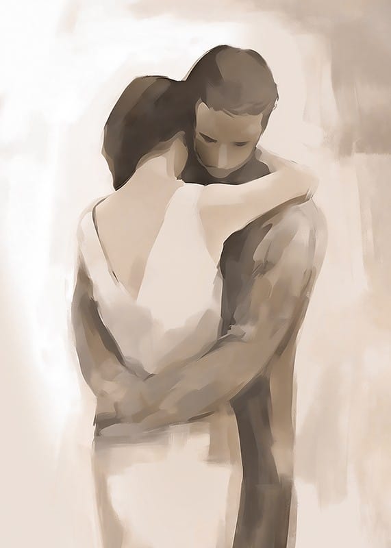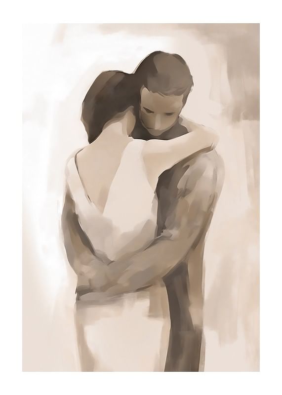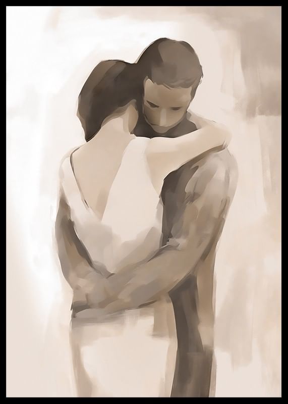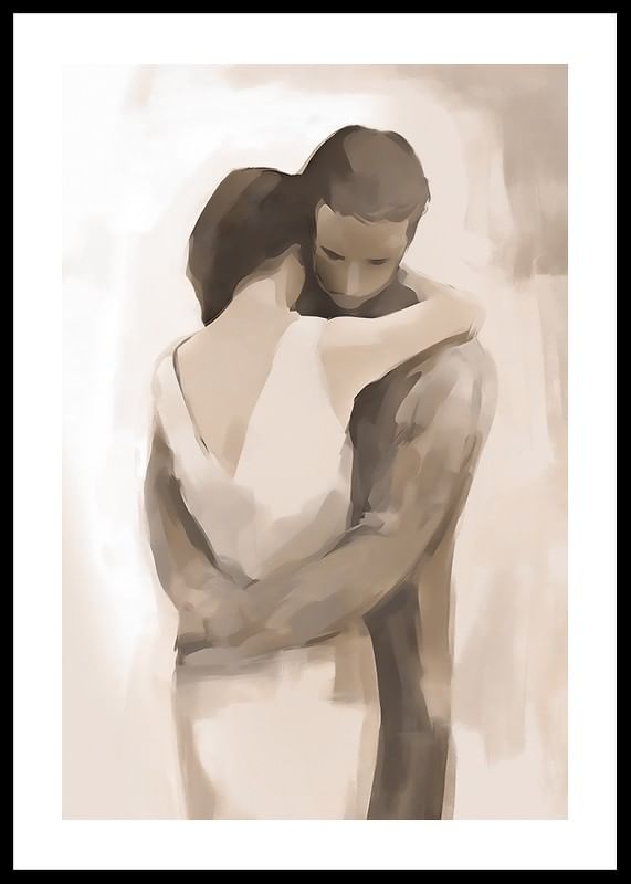 Two people embrace each other tightly in a minimalist motif with soft, diffuse lines and muted beige and brown tones. The fusion of the figures creates a calm and harmonious impression. This poster gives a warm and calm feeling in everything from bedrooms to living rooms and suits a variety of interior styles.