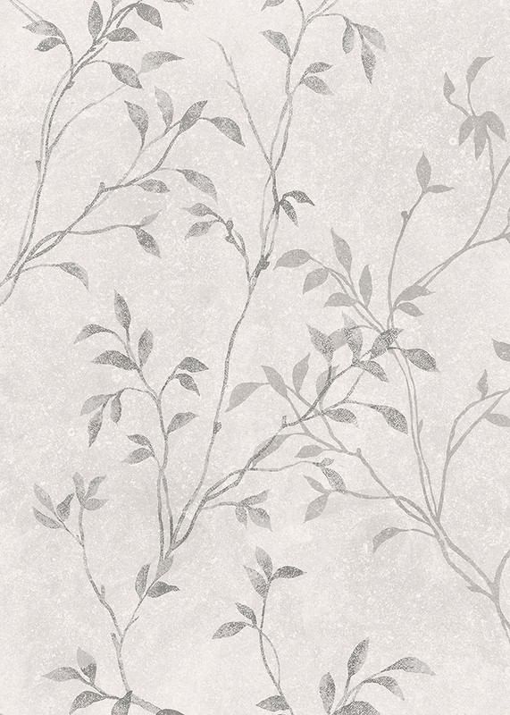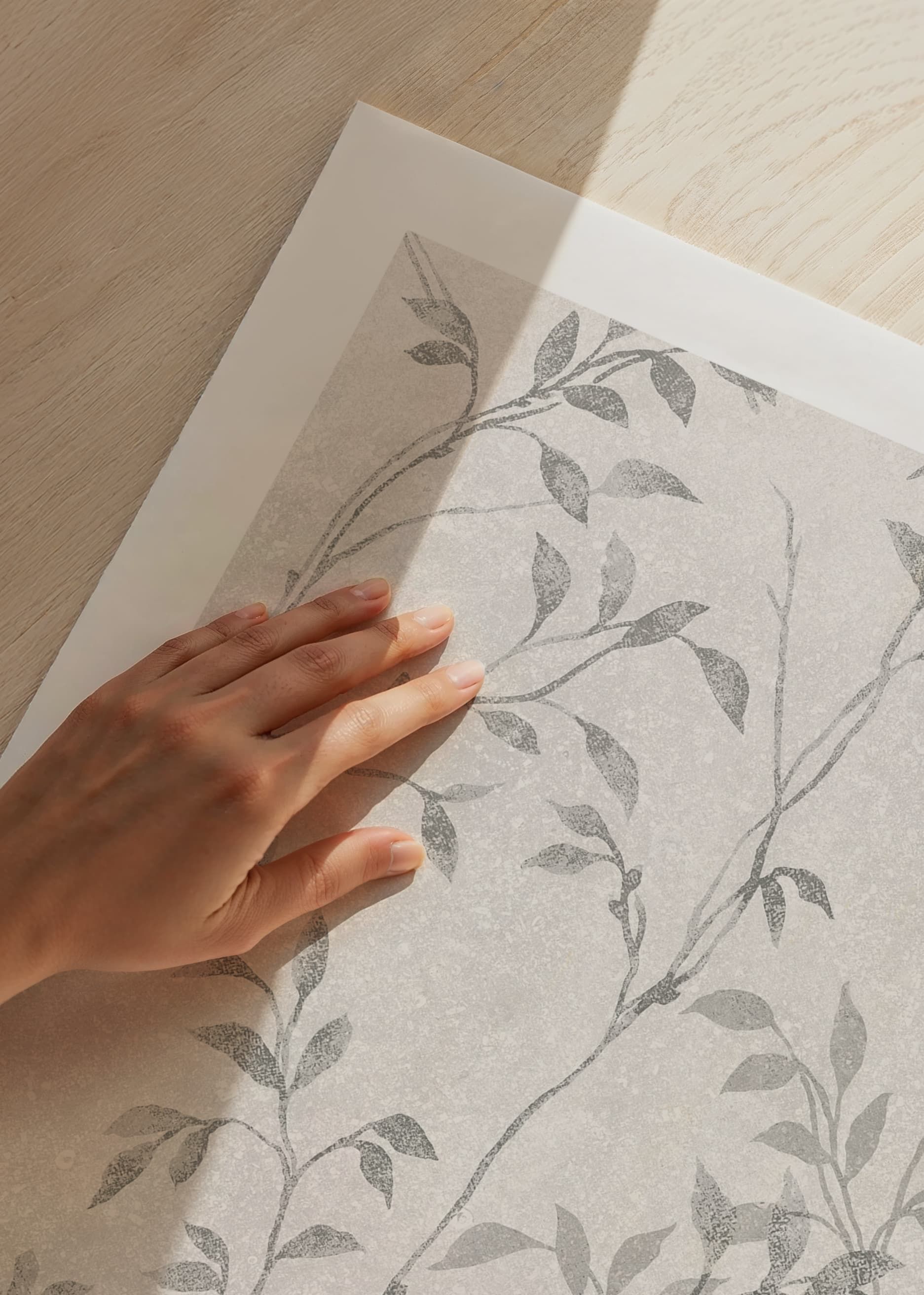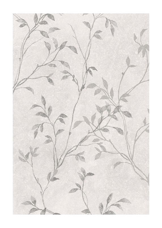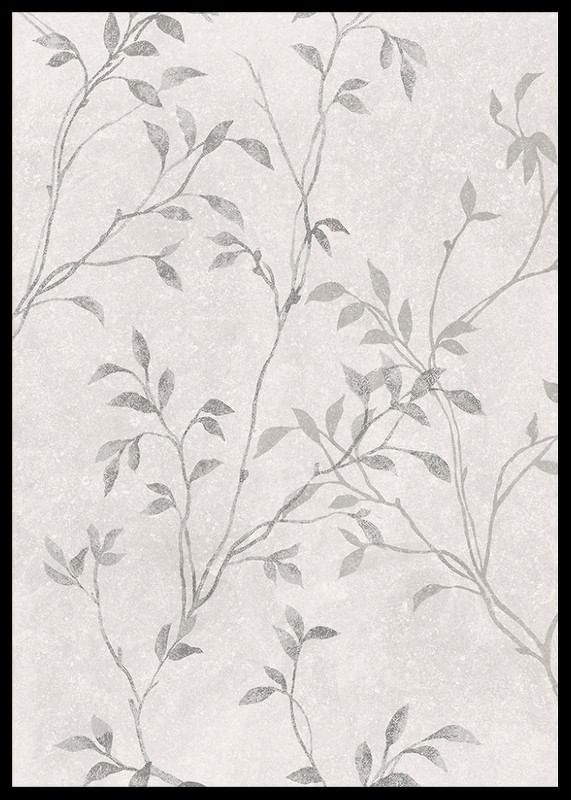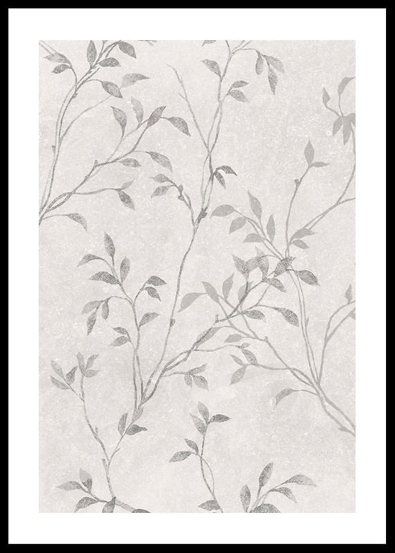 Branches with thin, winding shapes and small leaves stretch across a softly textured light background. The varying shades of grey create a subtle botanical pattern in a watercolor style. This poster adds a calm and airy touch, especially in bedrooms or living rooms where a subtle natural feel is desired.