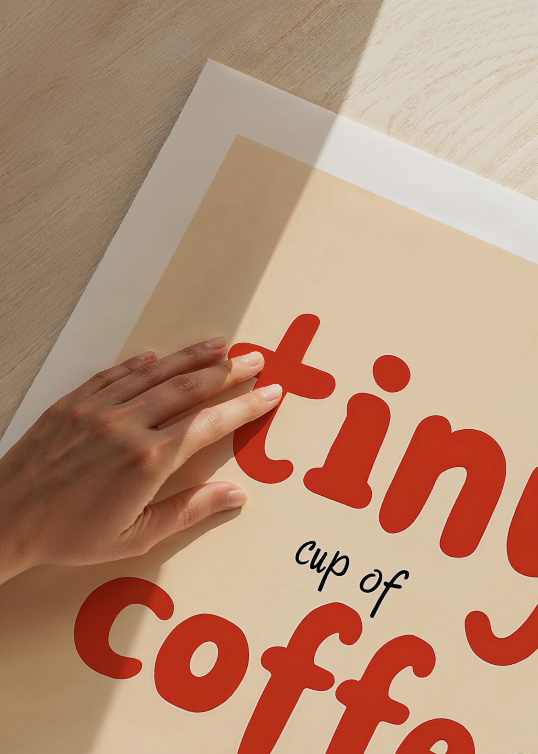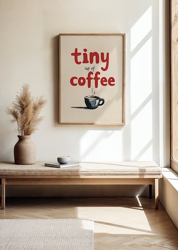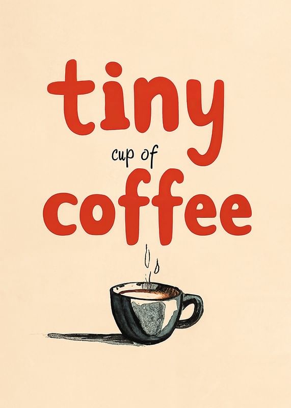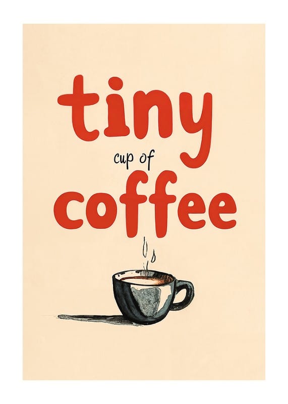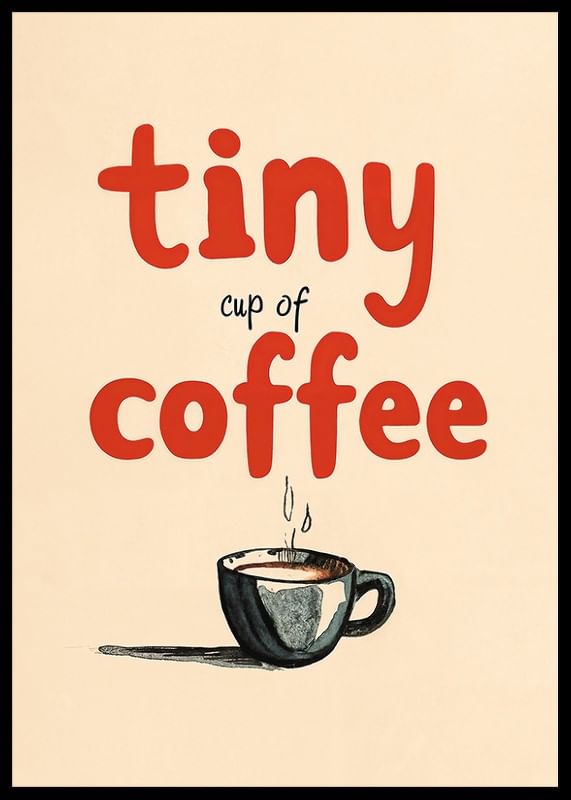 Poster with a watercolor painting of a coffee cup and the text "tiny cup of coffee" in large, red capitals that give a sense of playfulness and charm.