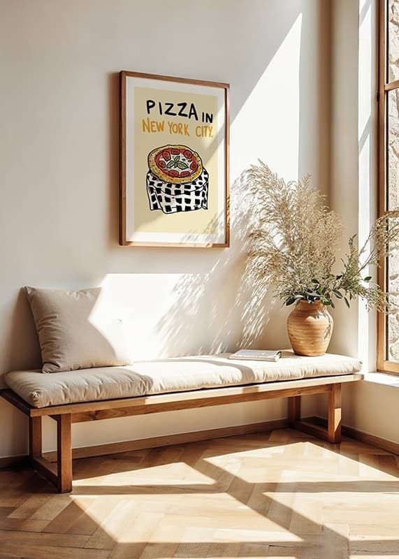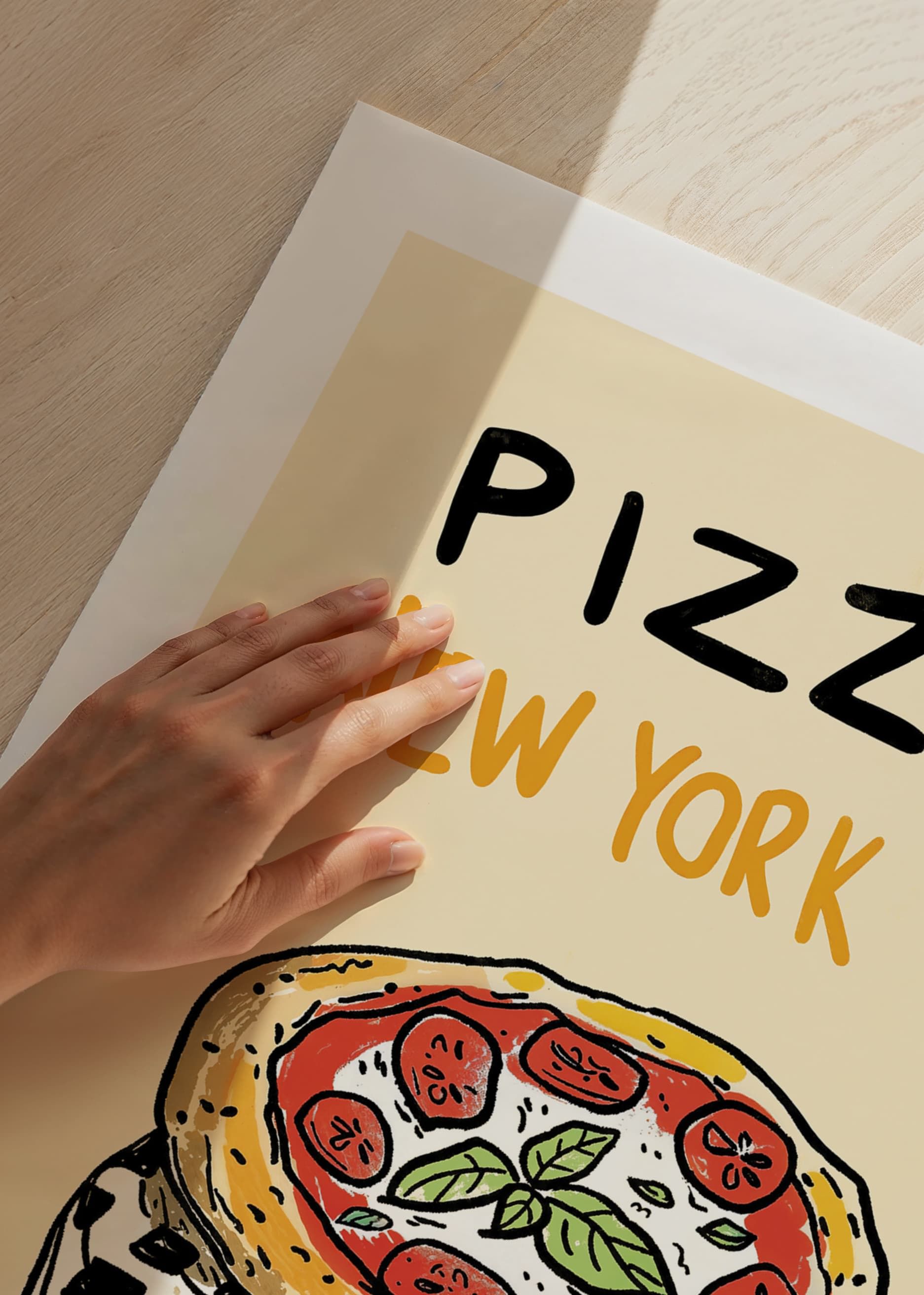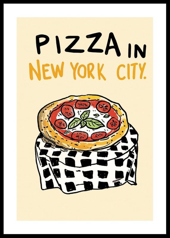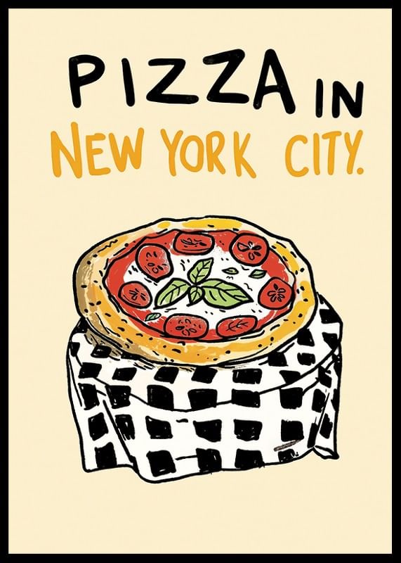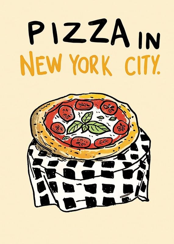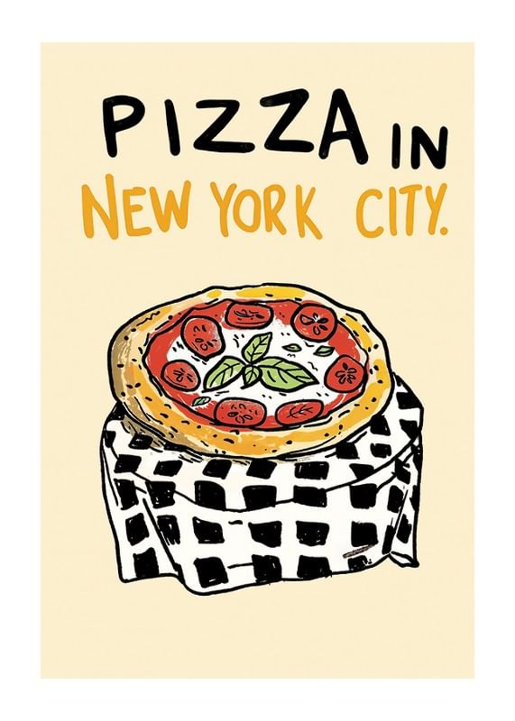 Poster with a colorful and playful illustration of a pizza on top of a black and white checkered box, with the text "PIZZA IN NEW YORK CITY."