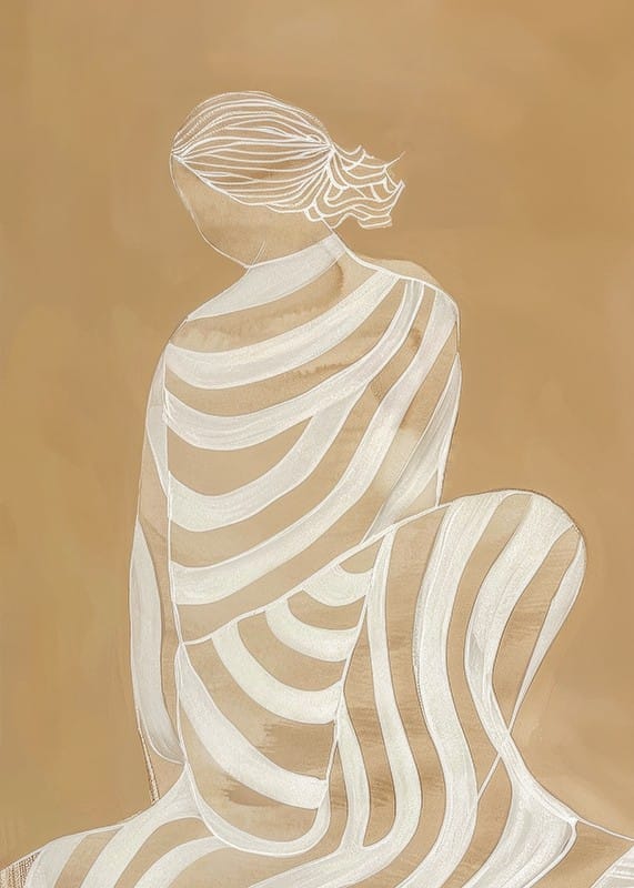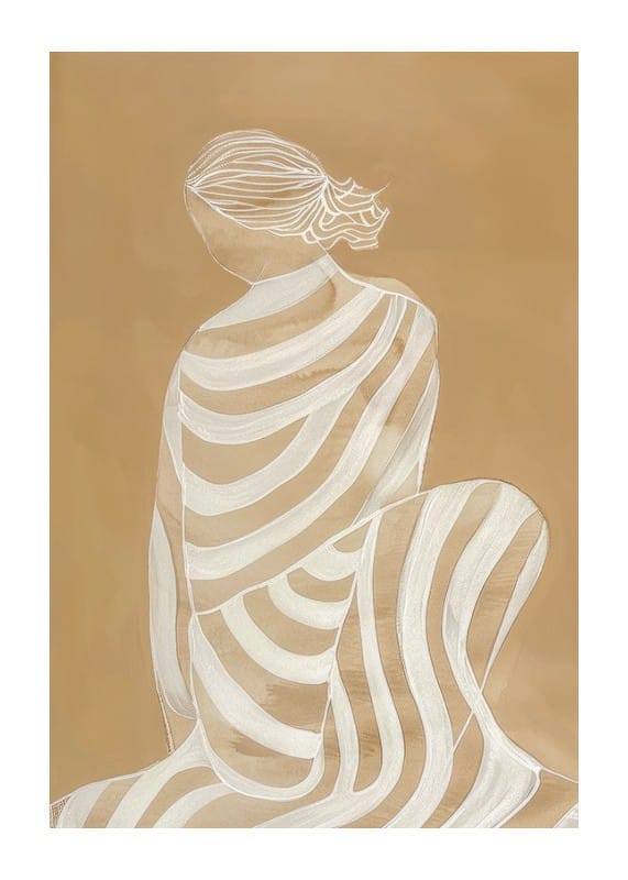 Poster with a watercolor painting in an abstract style of a woman in a striped white dress against a background in shades of brown.