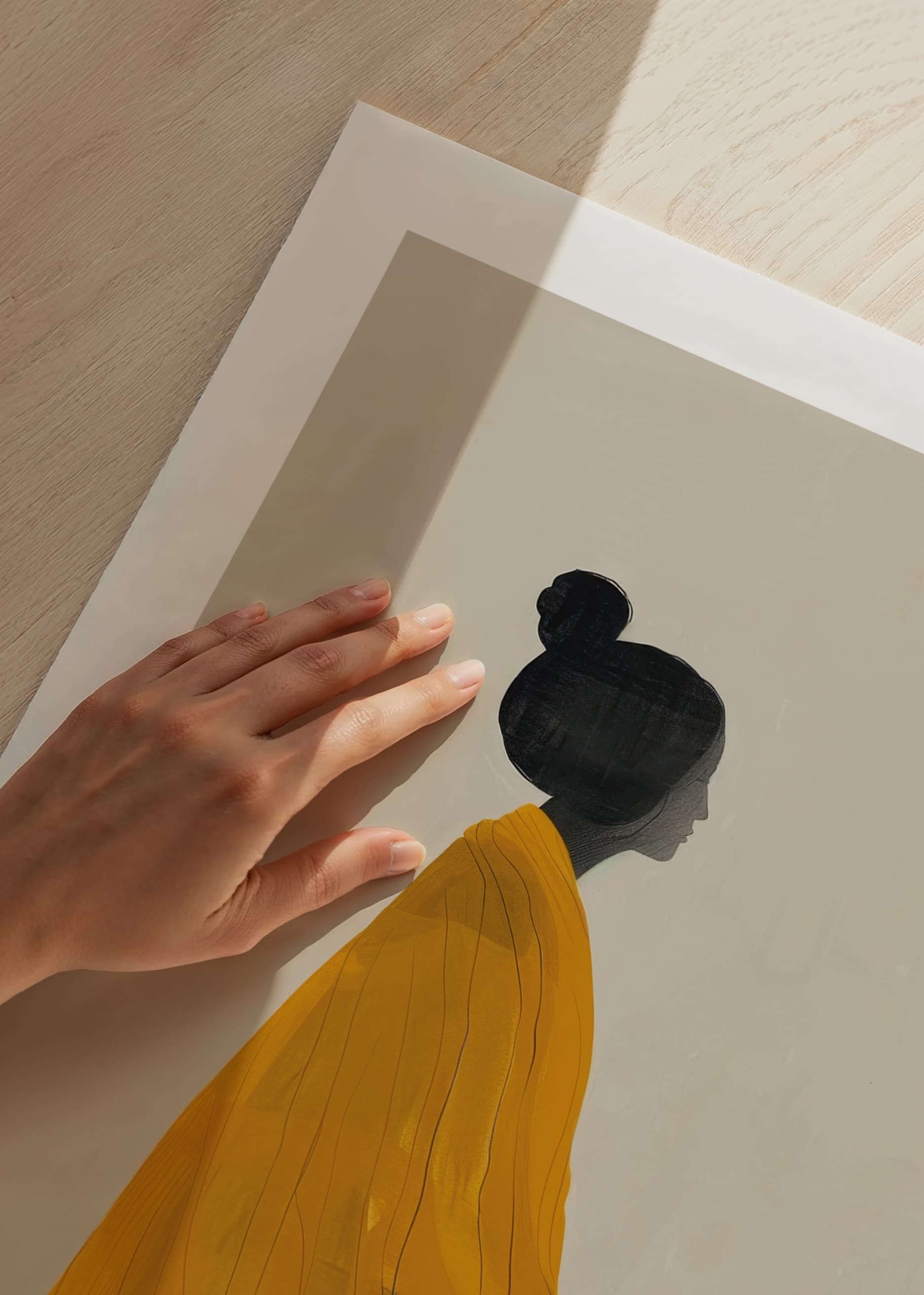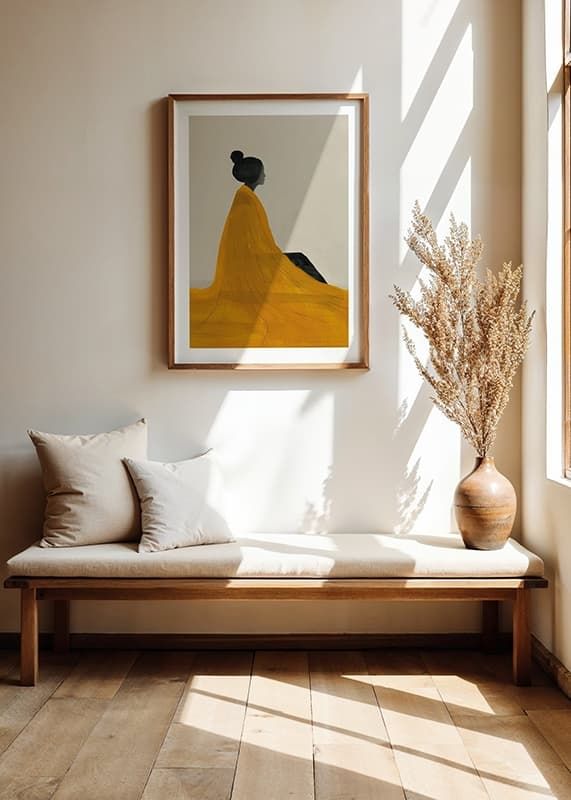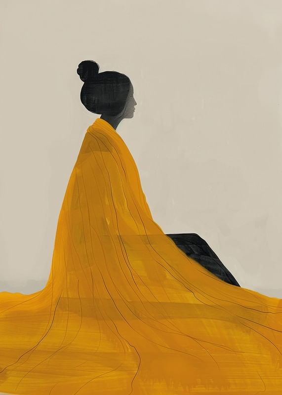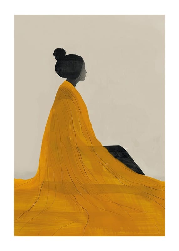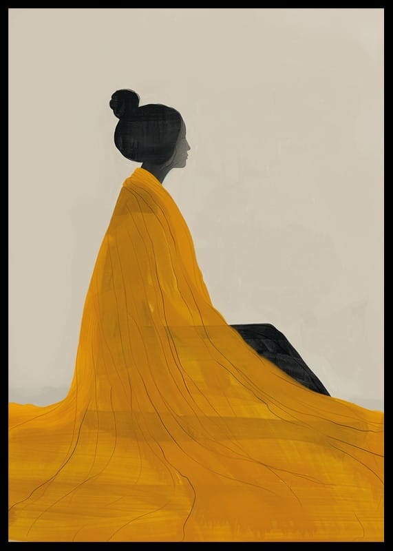 This elegant poster captures a timeless serenity with a beautiful watercolor painting of a woman in yellow, inspired by the Japanese Edo style. The soft brushstrokes and minimalist composition create a harmonious balance between simplicity and depth, while the golden yellow color gives the motif both warmth and energy. Perfect for those who want to decorate with art that exudes calm, beauty and sophisticated aesthetics.