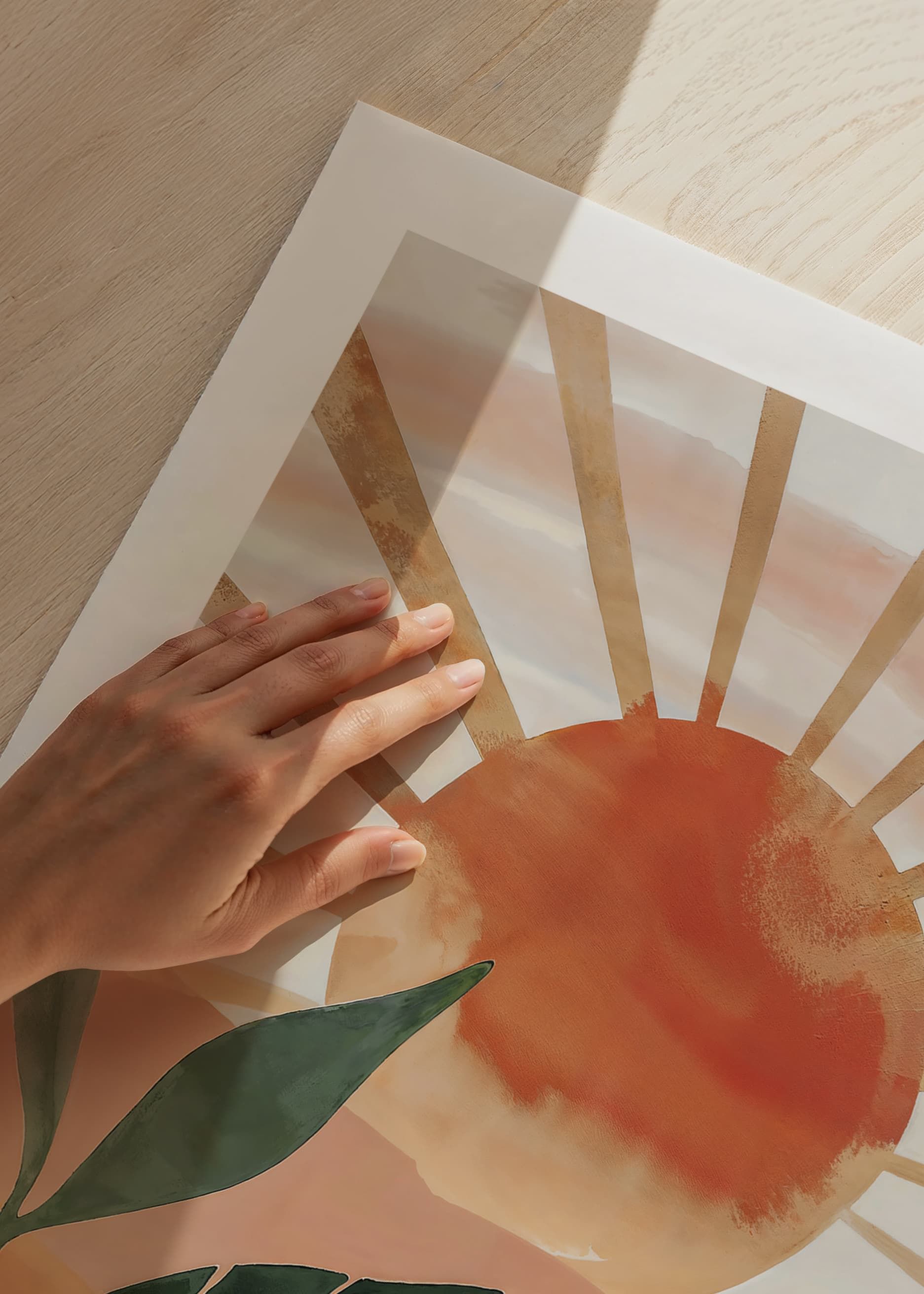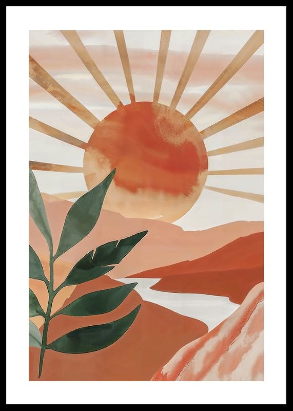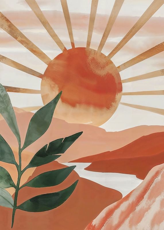 Poster with a watercolor painting that captures a peaceful dawn where the warm tones of the sun meet a lone plant in the foreground. The soft interplay between the pastel colors of the sky and the silhouettes of the vegetation creates a feeling of calm and hope.