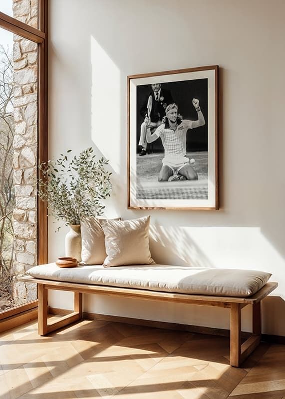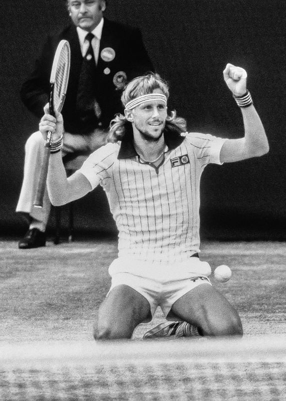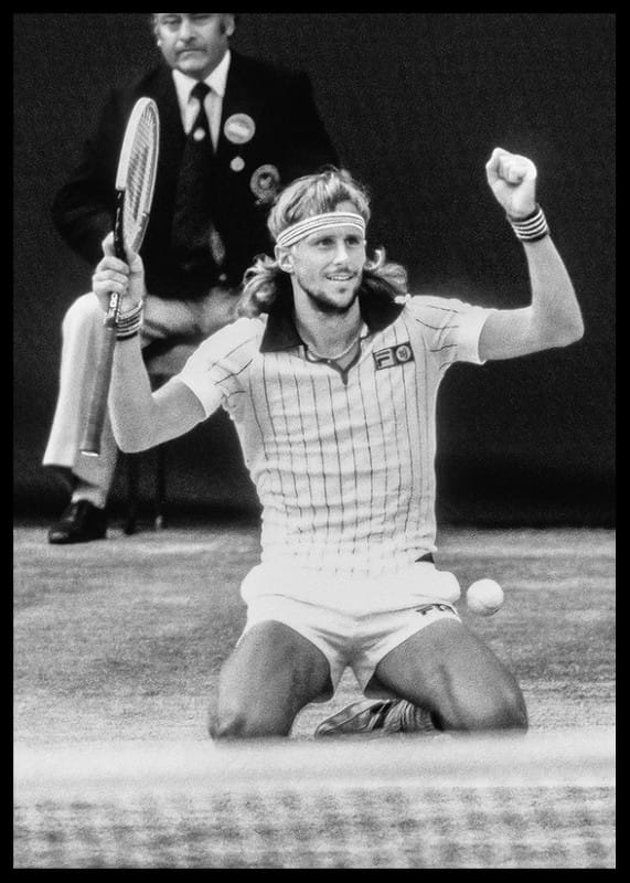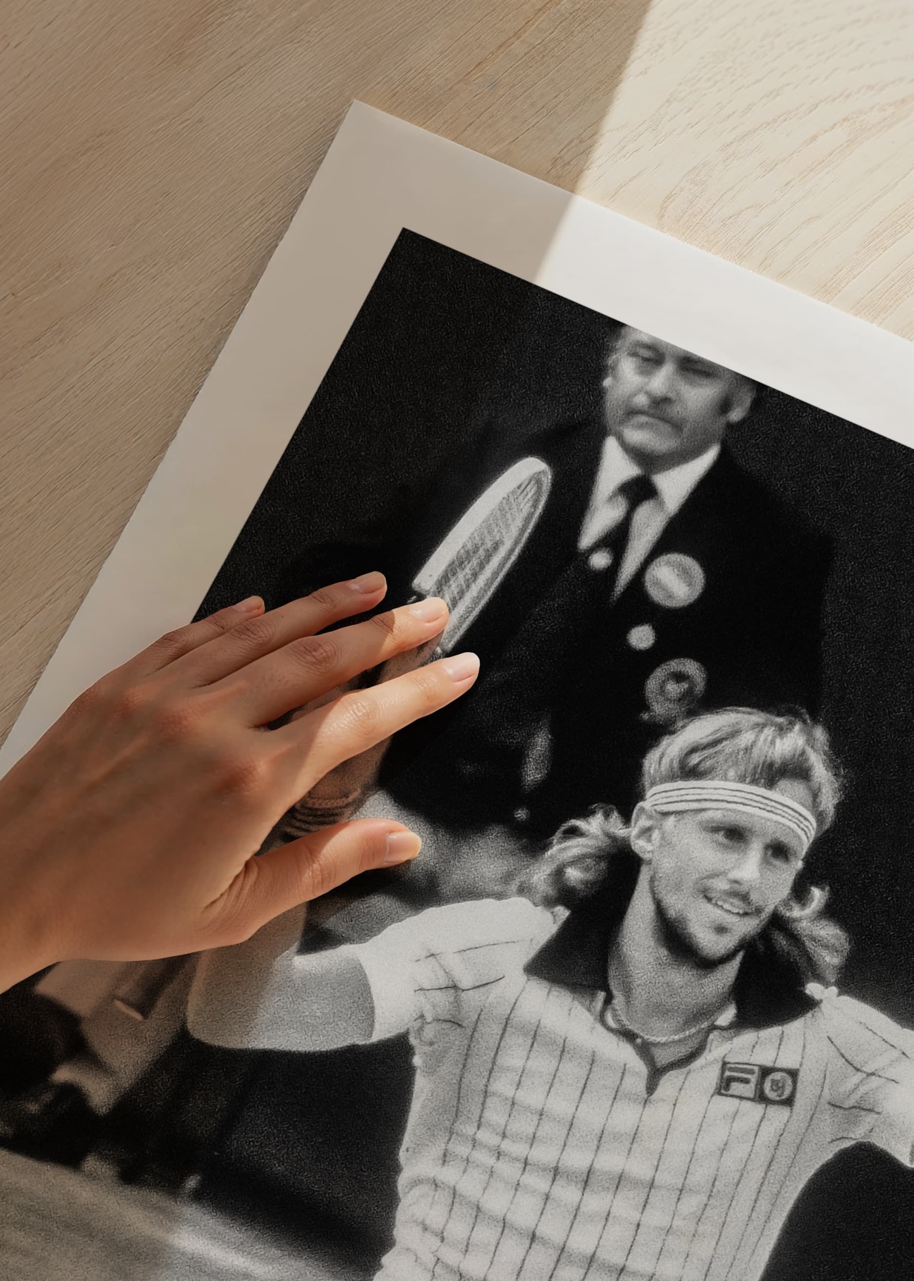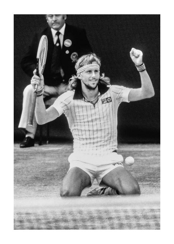 Black and white poster with a photograph of the Swedish tennis player Björn Borg during Wimbledon in 1979. During the period 1974–1981, Borg won eleven singles titles in Grand Slam tournaments, including five in a row in the Wimbledon Championships 1976–1980.