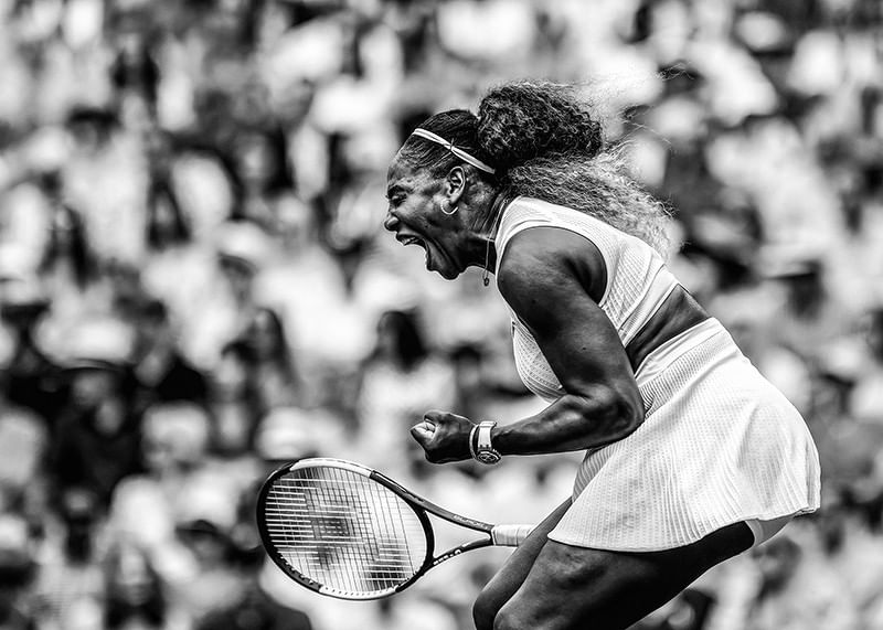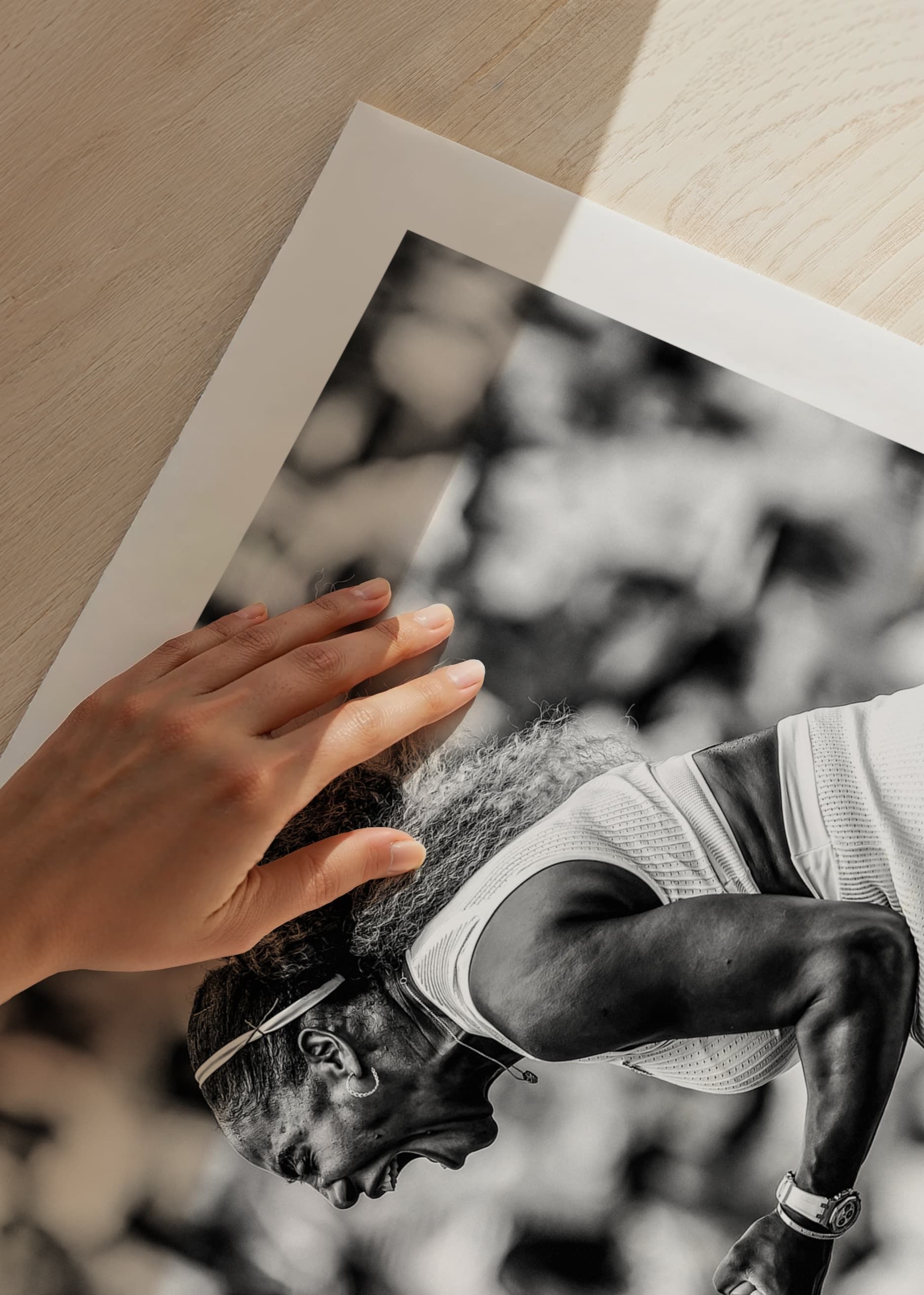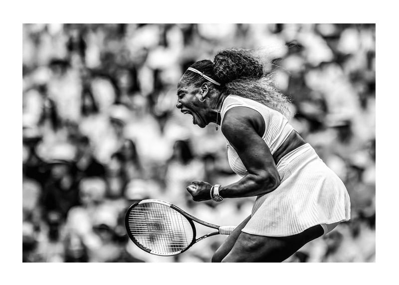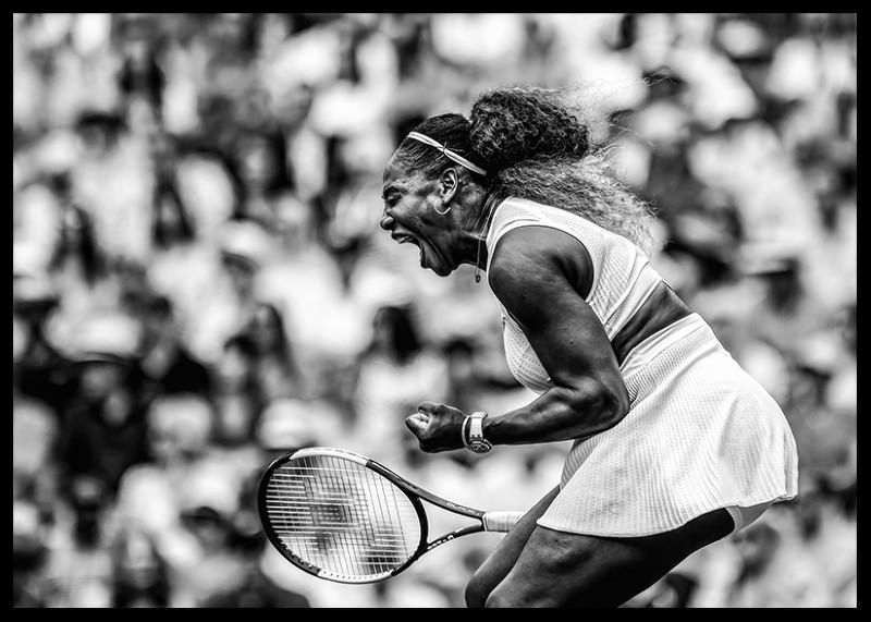 Black and white poster with a photograph of tennis star Serena Williams from the USA during a match at Wimbledon in 2019.