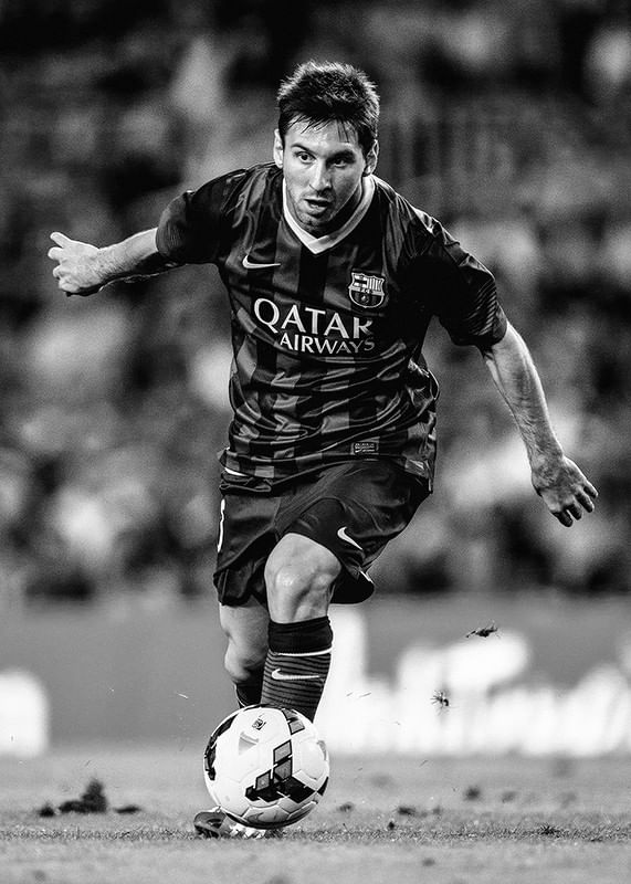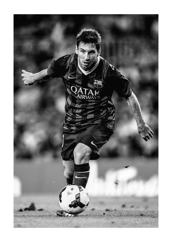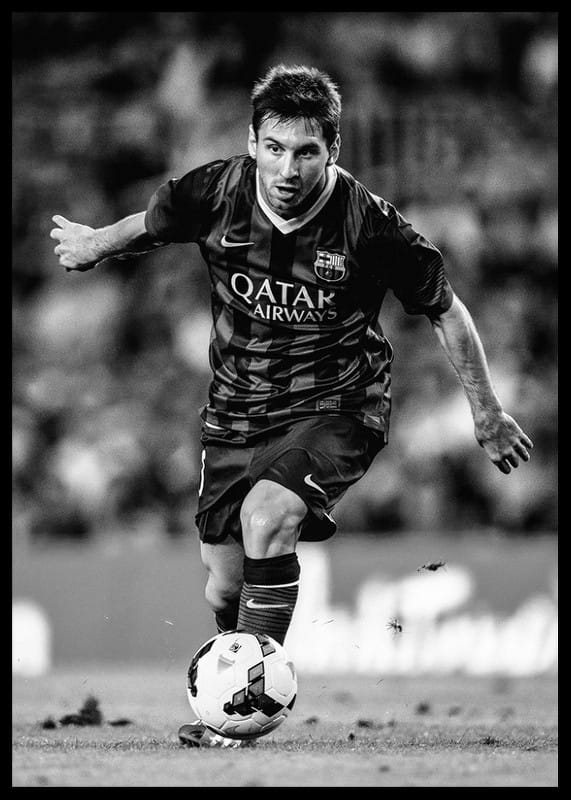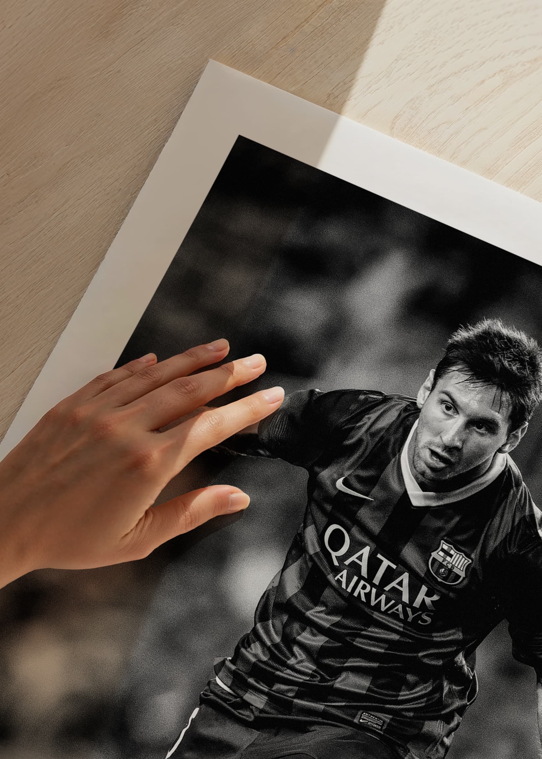 Black and white poster with a photograph of Lionel Messi in FC Barcelona during a match against Santos in Barcelona in 2013.