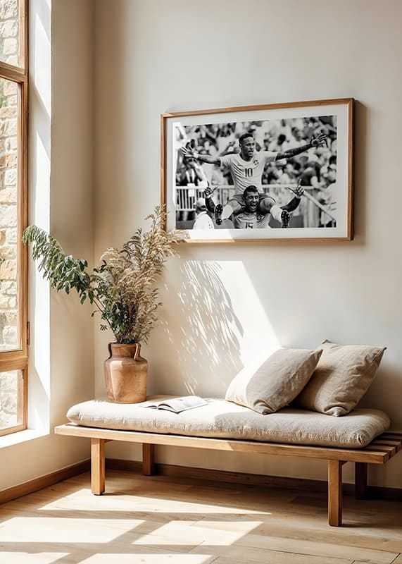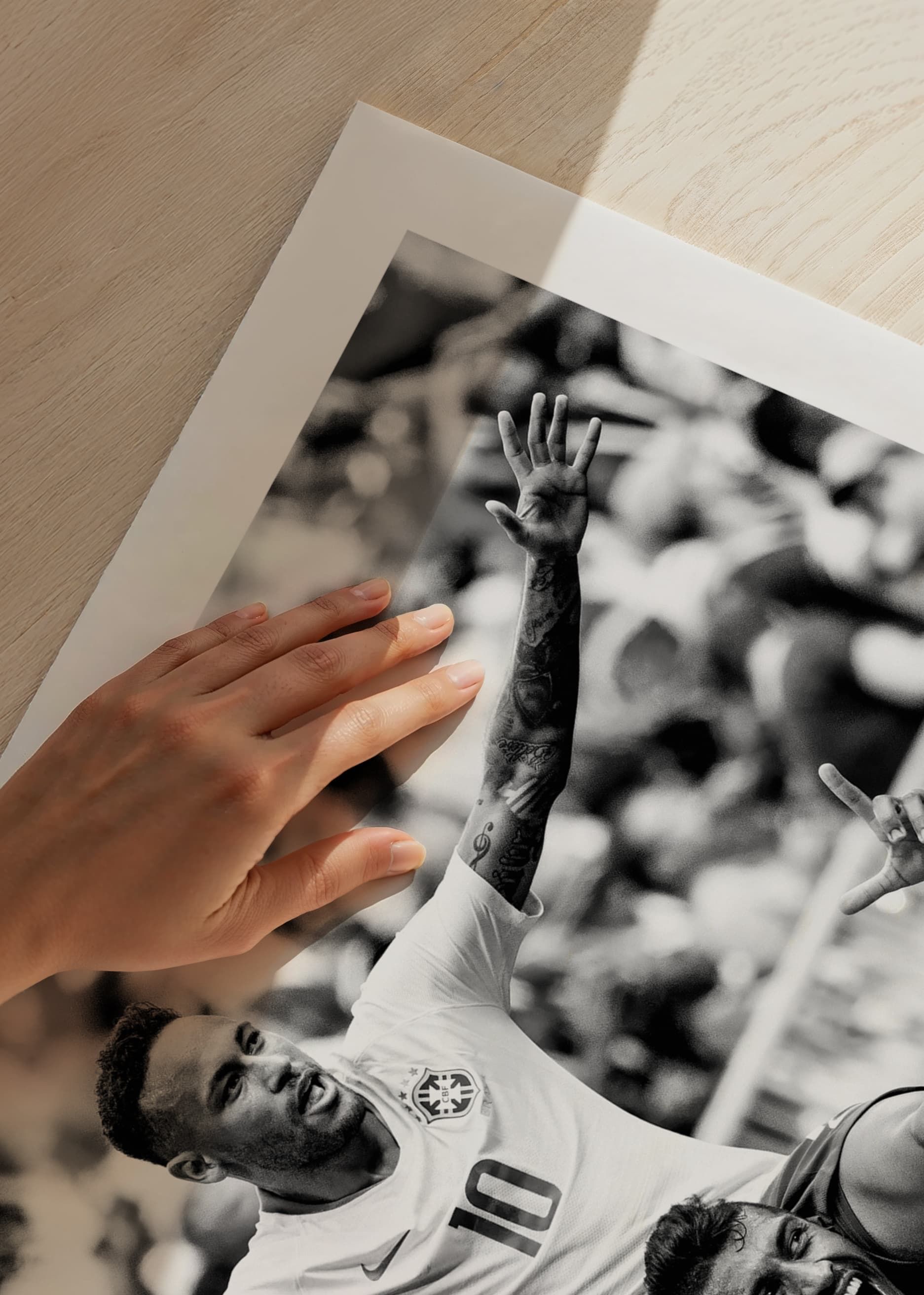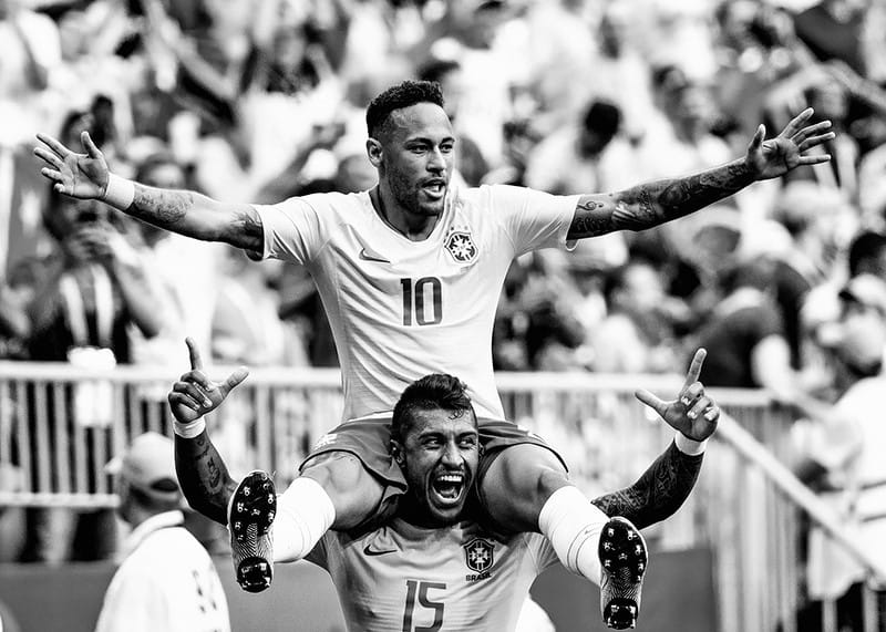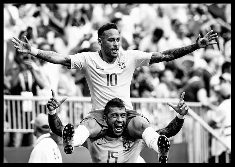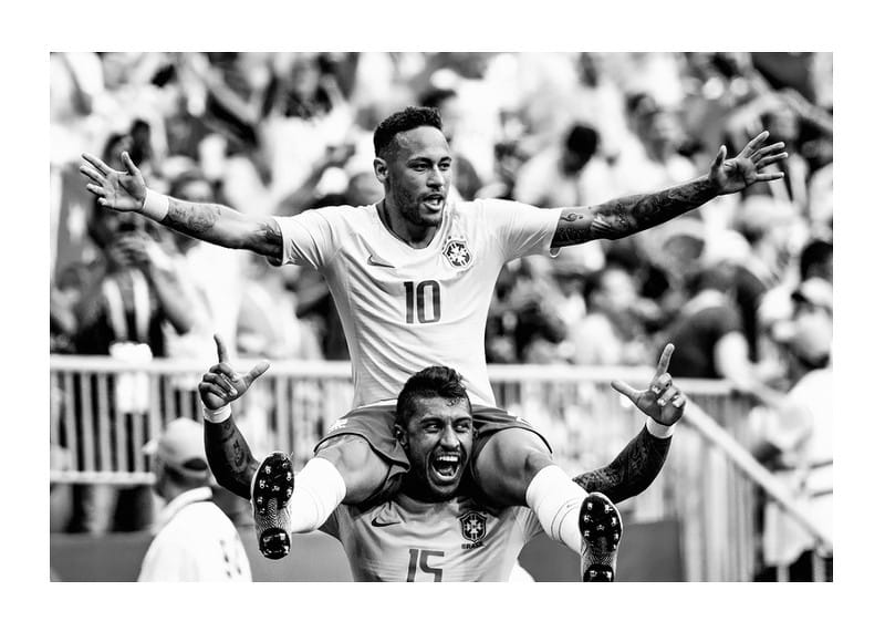 Black and white poster with a photograph of Brazilian football stars Neymar Jr and Paulinho during the 2018 FIFA World Cup in Russia.