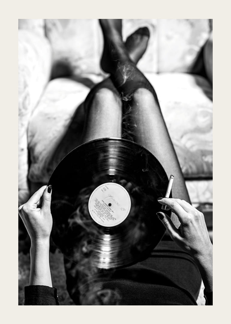 Poster from the photo art category with a vintage black and white photograph of a woman holding a vinyl record.