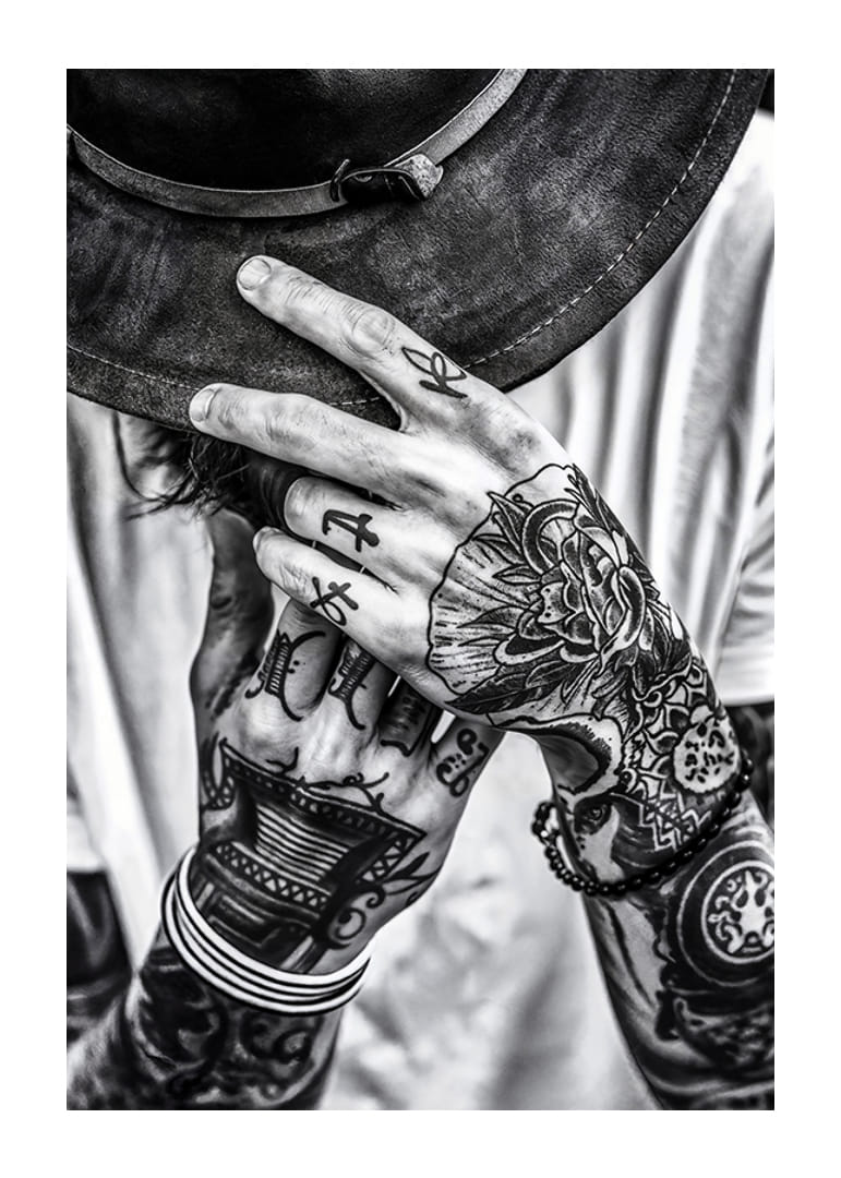 Poster from the Photo Art category featuring a black and white photograph that captures the essence of self-expression through detailed tattoos and a wide-brimmed hat, creating a sense of mystery and individuality.