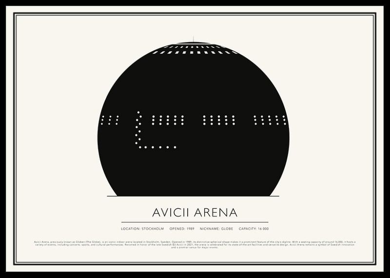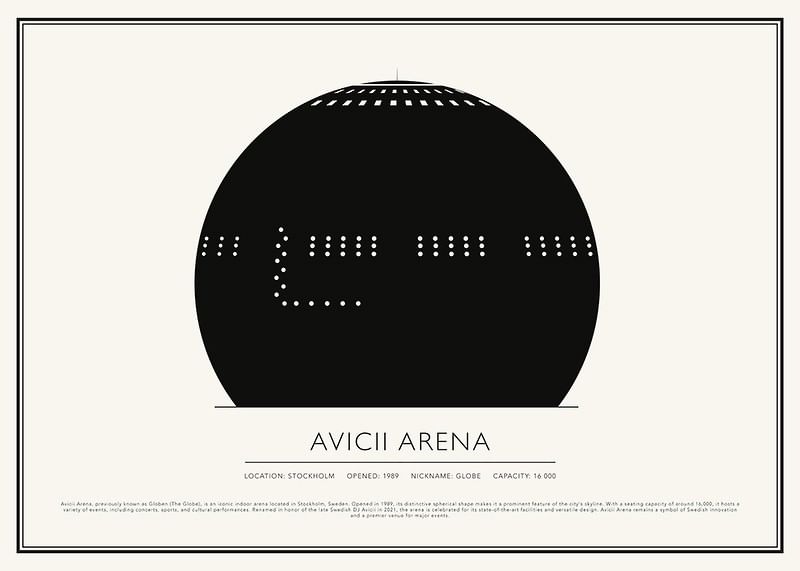 Avicii Arena, previously known as Globen (The Globe), is an iconic indoor arena located in Stockholm, Sweden. Opened in 1989, its distinctive spherical shape makes it a prominent feature of the city's skyline. With a seating capacity of around 16,000, it hosts a variety of events, including concerts, sports, and cultural performances. Renamed in honor of the late Swedish DJ Avicii in 2021, the arena is celebrated for its state-of-the-art facilities and versatile design. Avicii Arena remains a symbol of Swedish innovation and a premier venue for major events.