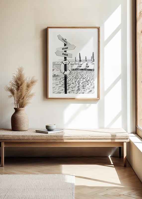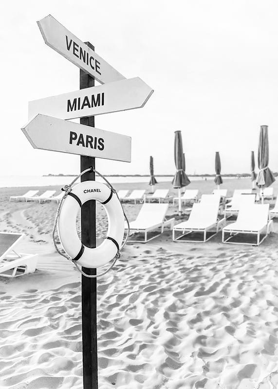 This elegant poster in black and white captures the feeling of luxurious vacation and adventure. On a sunny beach stands a sign with arrows pointing to iconic destinations: Venice, Miami and Paris. Below the sign hangs a lifebuoy labeled "Chanel," adding a touch of exclusivity. The image conveys a sense of travel and dreams of the world's most sought-after locations, perfect for inspiring global adventure and sophisticated style.
