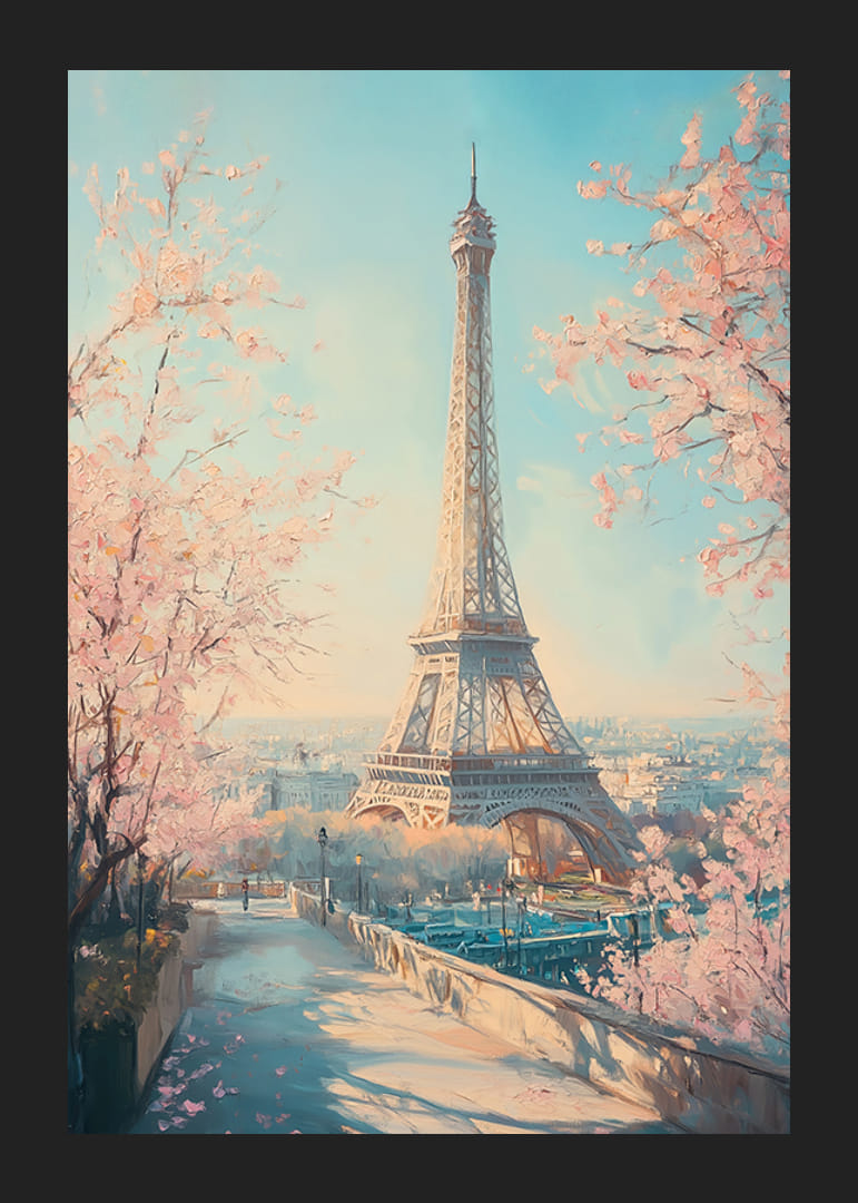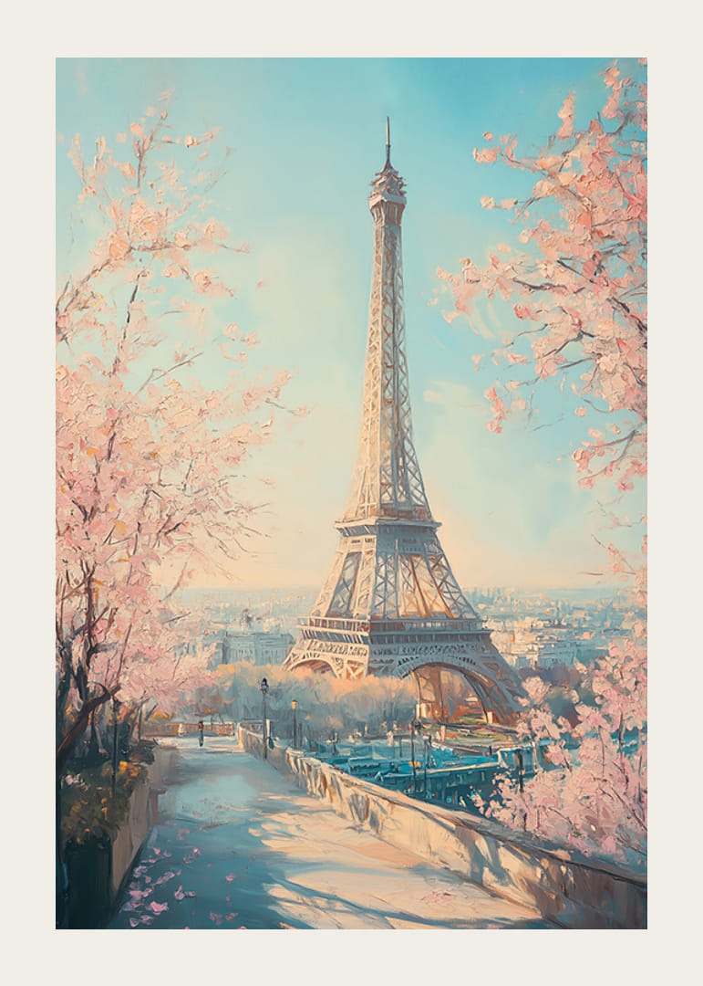 Capture the romance with this poster depicting the Eiffel Tower surrounded by cherry blossoms on a soft spring day. With pastel tones and a dreamy atmosphere, the image conveys the timeless charm and beauty of Paris. Perfect for creating an elegant and romantic feel in your home, this poster is a tribute to the city of love and the magical floral splendor of spring.