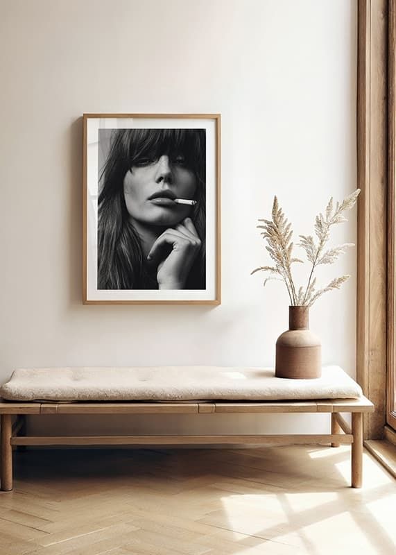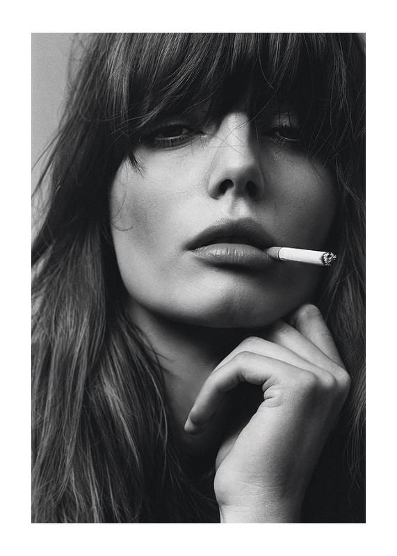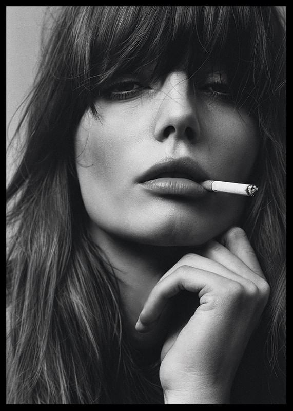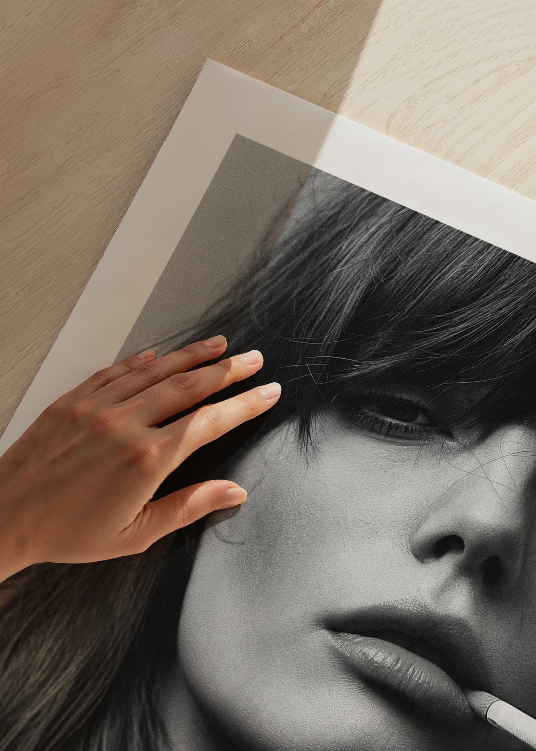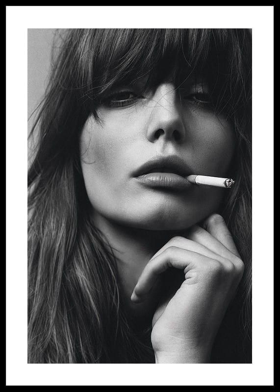 This poster captures a raw and iconic beauty in black and white, where a woman with unkempt long hair and intense eyes stares straight into the camera. Her nonchalant posture with a cigarette between her lips gives the image a sense of rebellious attitude and timeless elegance. The subtle shadows highlight her strong features and create a mystery that permeates the entire image. Perfect for anyone looking to add a sense of boldness and sophistication to their space, conveying an artistic expression of both strength and vulnerability.