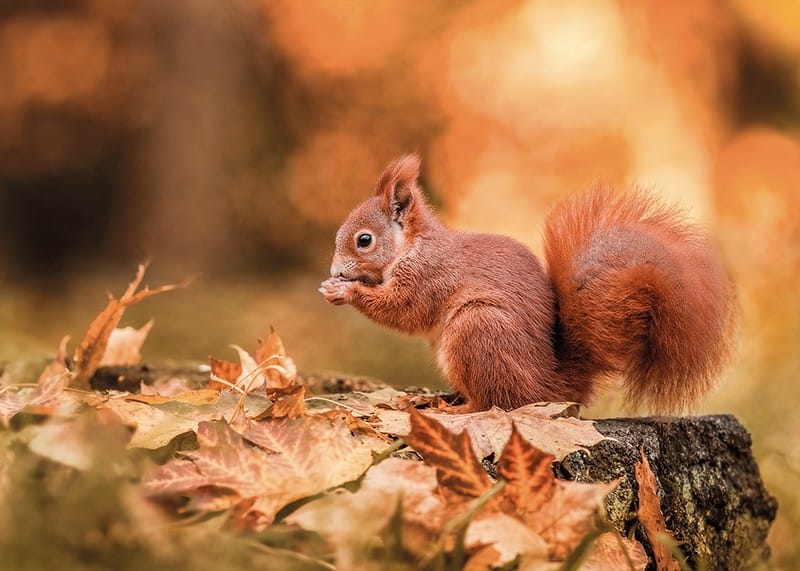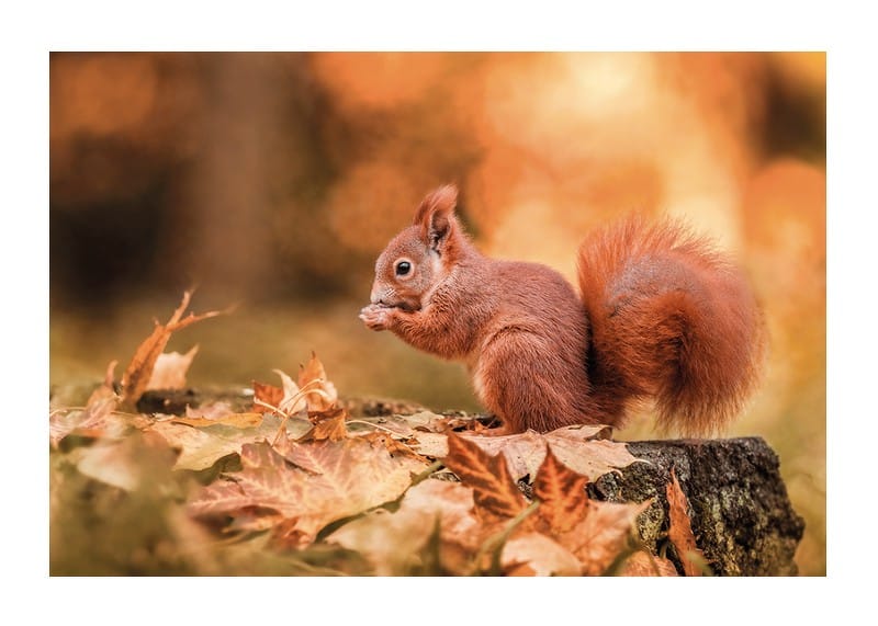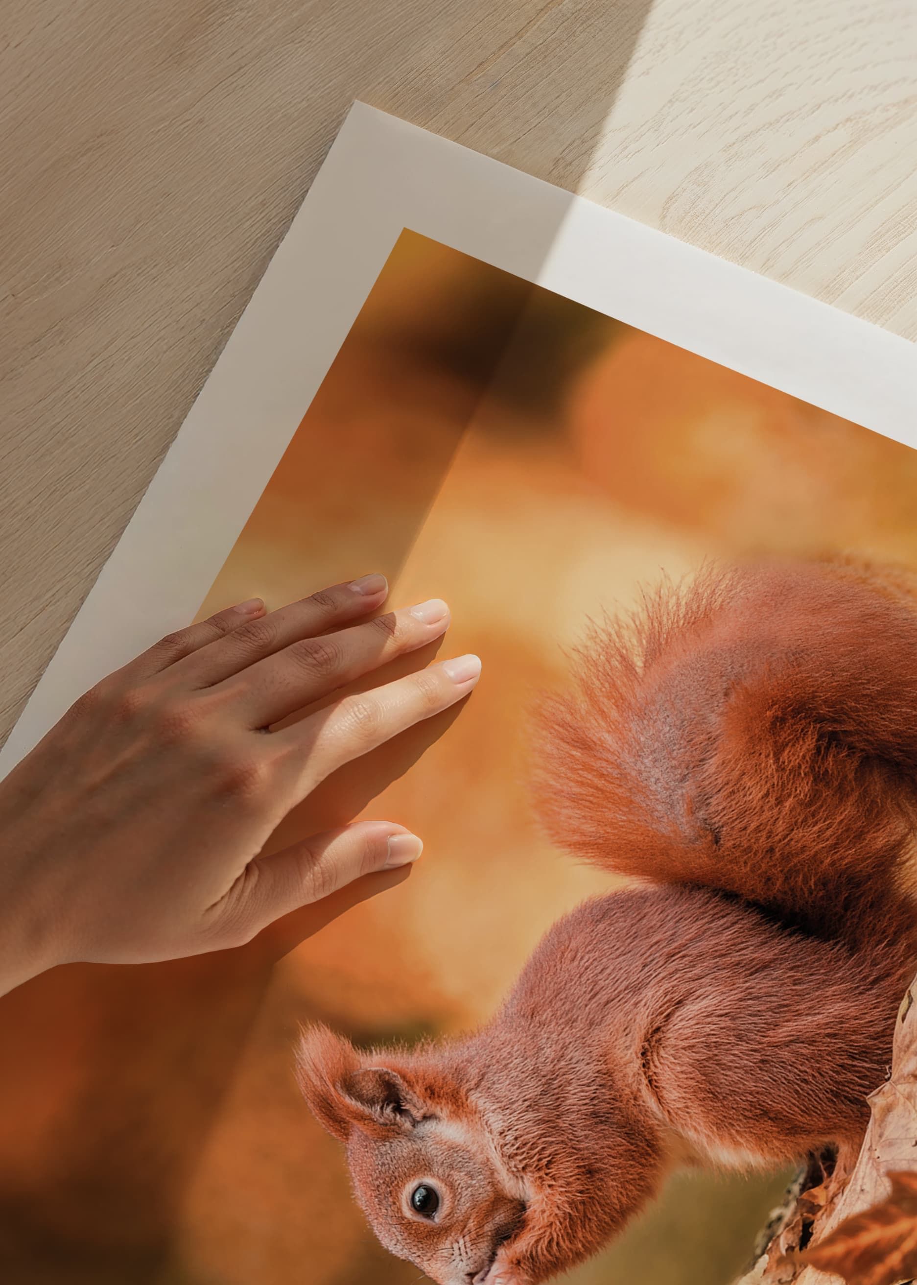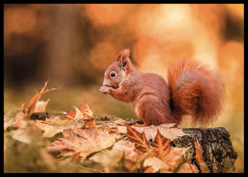 This poster captures a charming autumn moment with a lively squirrel sitting among golden leaves preparing for winter. The warm color palette and the soft light create a cozy atmosphere that embraces the beauty of autumn.