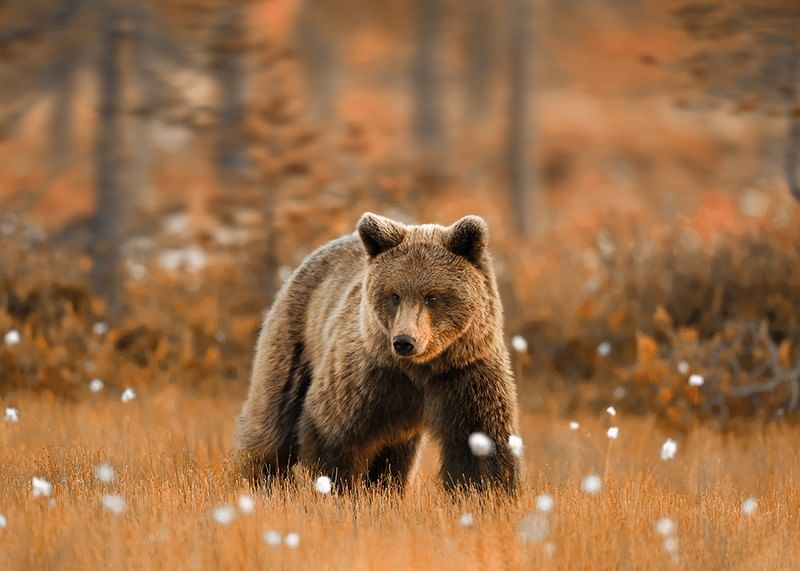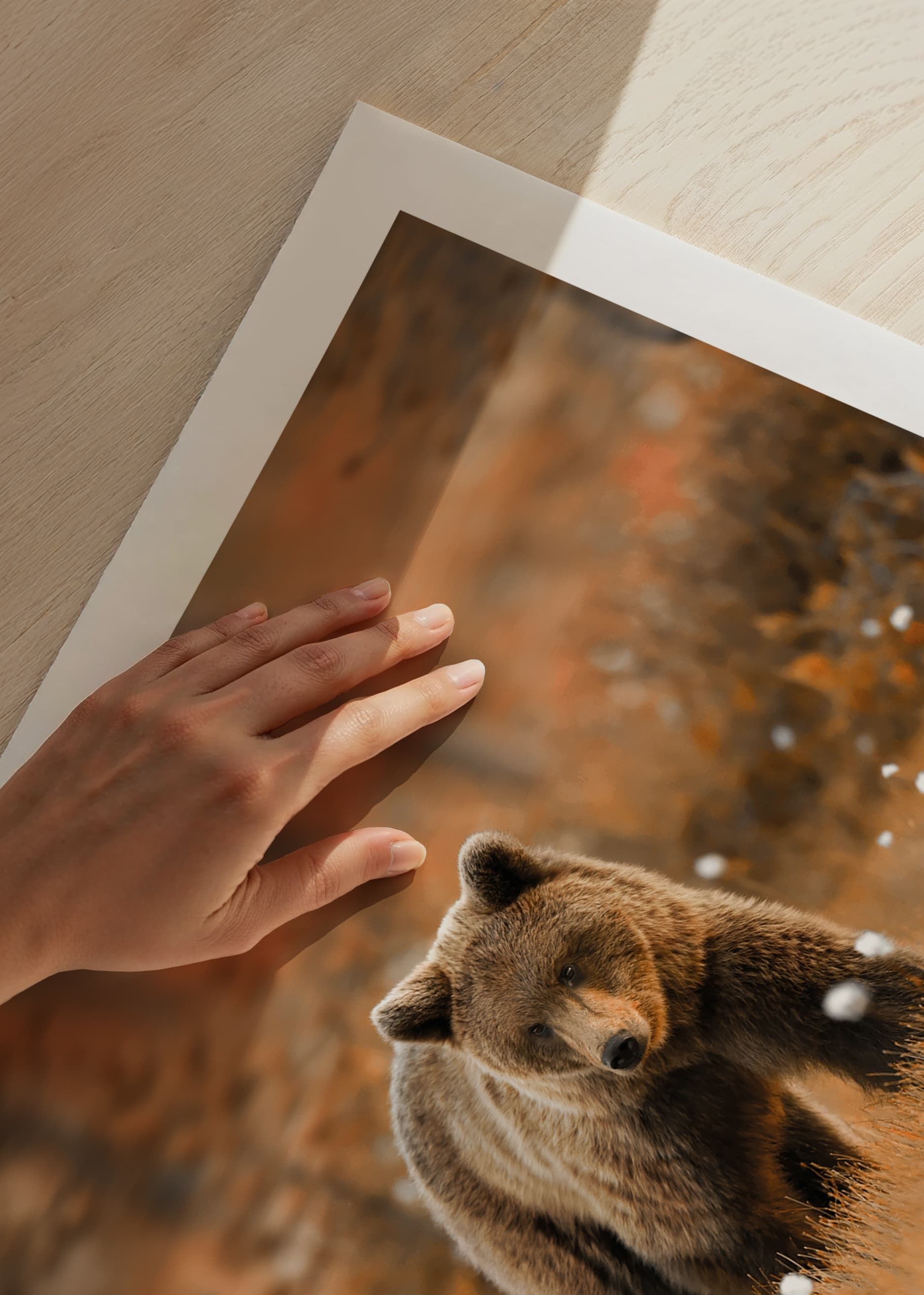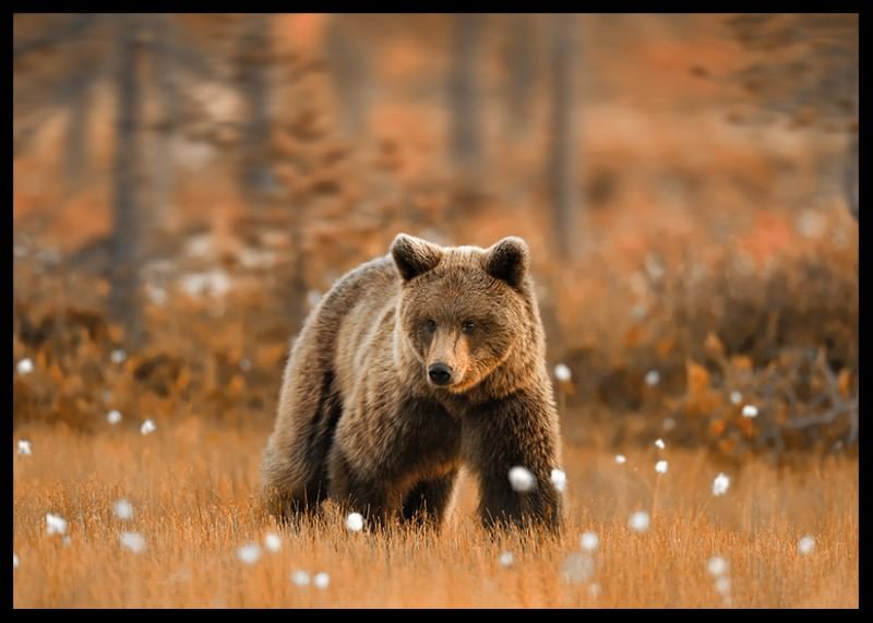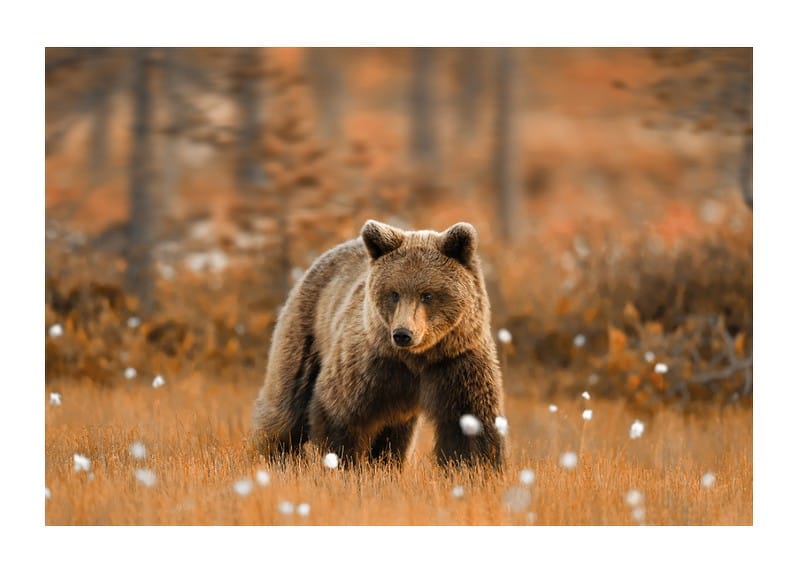 This poster captures a powerful yet peaceful bear in a golden autumn landscape. The bear moves through a meadow covered in soft, white flowers, while the warm autumn tones in the background create a harmonious contrast. The image radiates both strength and calm and highlights the wild beauty of nature.