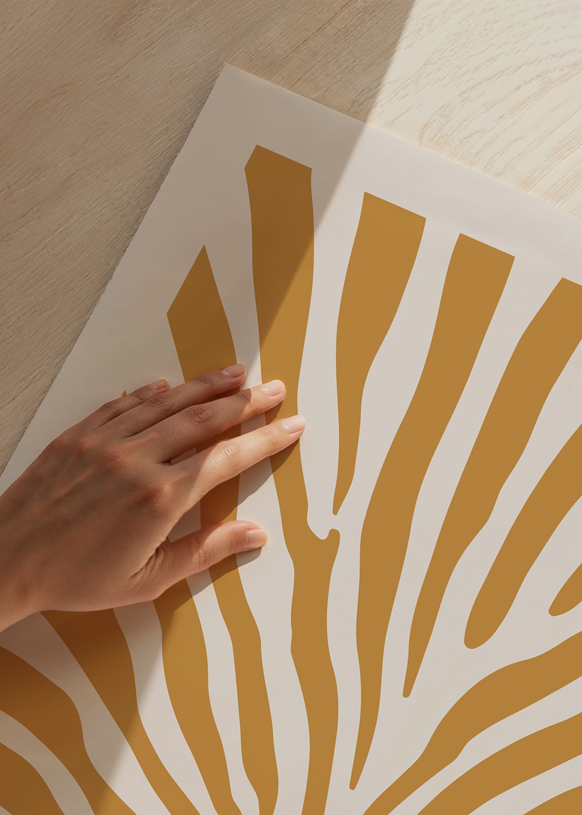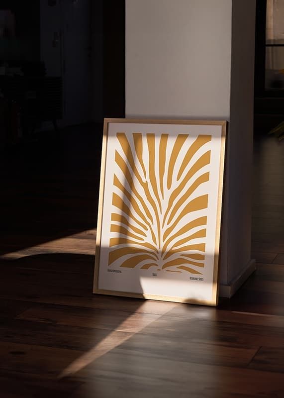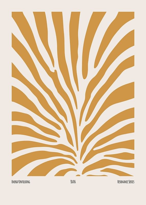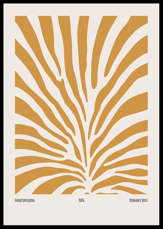 This poster shows an abstract, undulating pattern of white lines flowing like a current over a warm, mustard yellow background. The lines are thin and bend gently, creating a sense of movement and flow, as if the wind sweeps through the air or waves move on the surface of the water. The poster conveys a sense of lightness and elegance with its minimalist design and harmonious balance between colors and shapes.