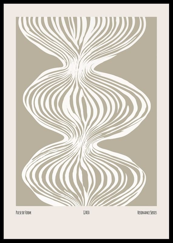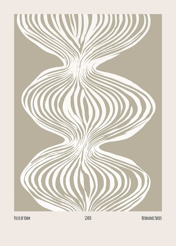 This poster shows an abstract pattern with white, flowing lines creating a symmetrical, wavy structure on a neutral, beige background. The pattern gives the illusion of movement and depth, almost like sound waves or organic shapes extending out from the center. The contrast between the thin white lines and the calm background gives a harmonious and balanced impression. A stylish and modern art poster.