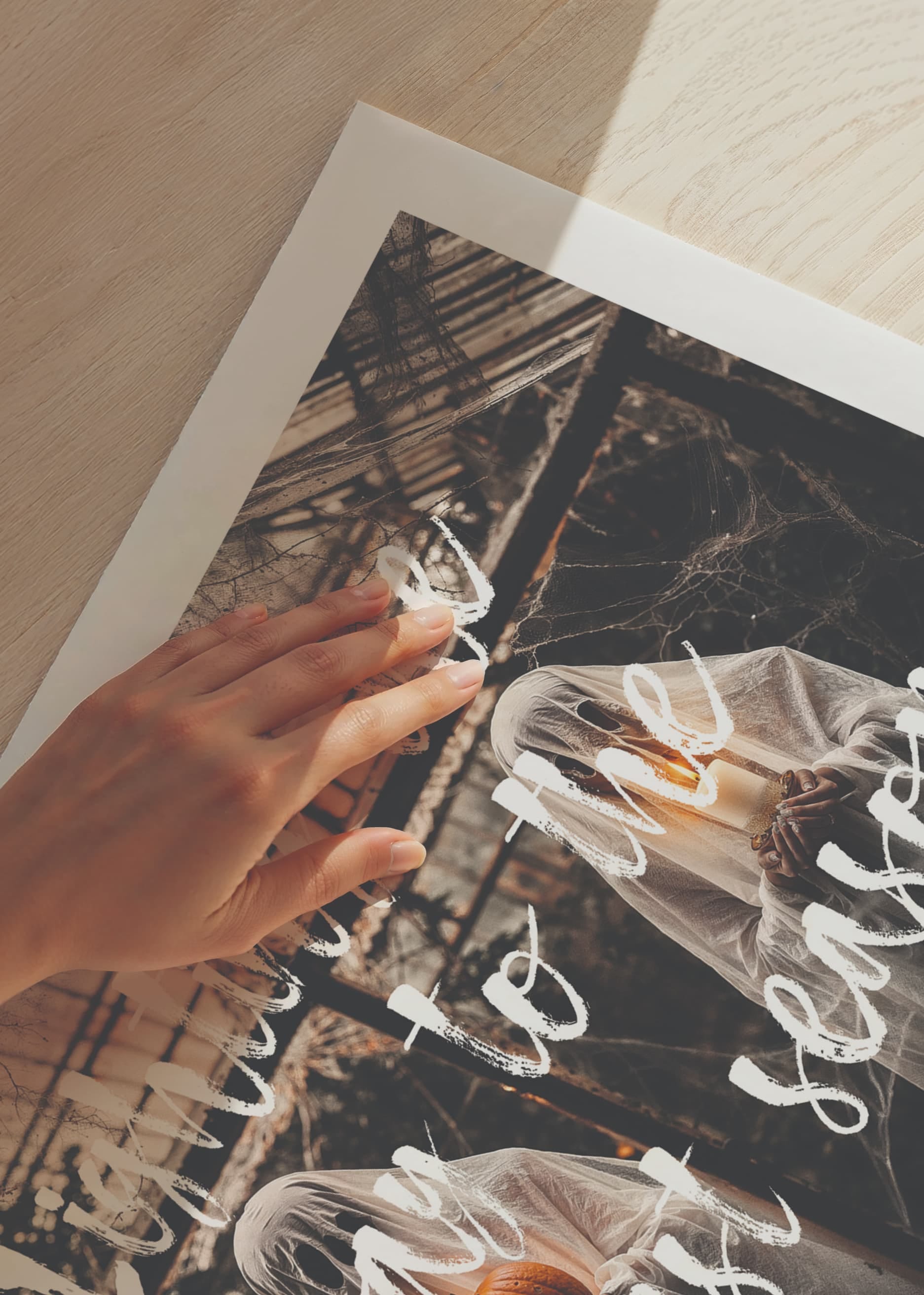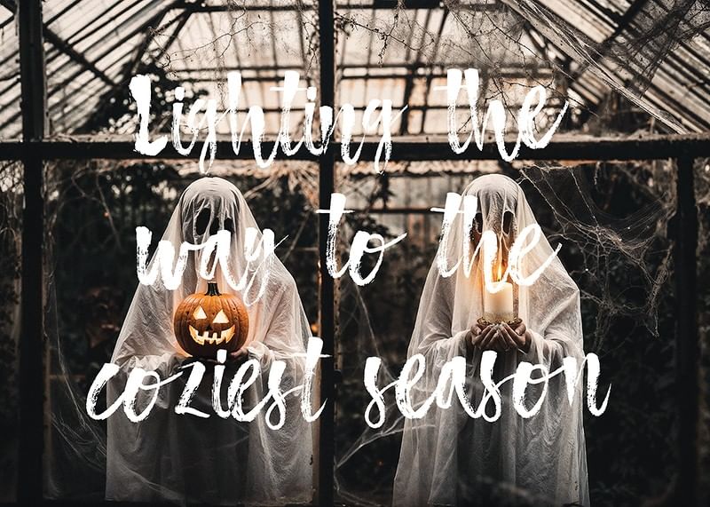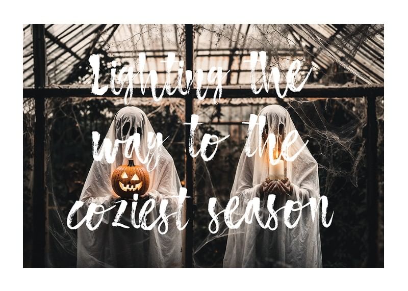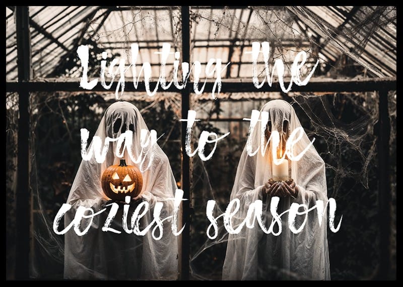 This poster combines the spooky with the cozy, showing two ghostly figures in an abandoned greenhouse, lit by a pumpkin lantern and a candle. The text "Lighting the way to the coziest season" reinforces the feeling that autumn can be both mysterious and inviting. The dark tones and cobweb-covered glass panes create an atmosphere that both celebrates Halloween and the warm, embracing feeling of autumn.